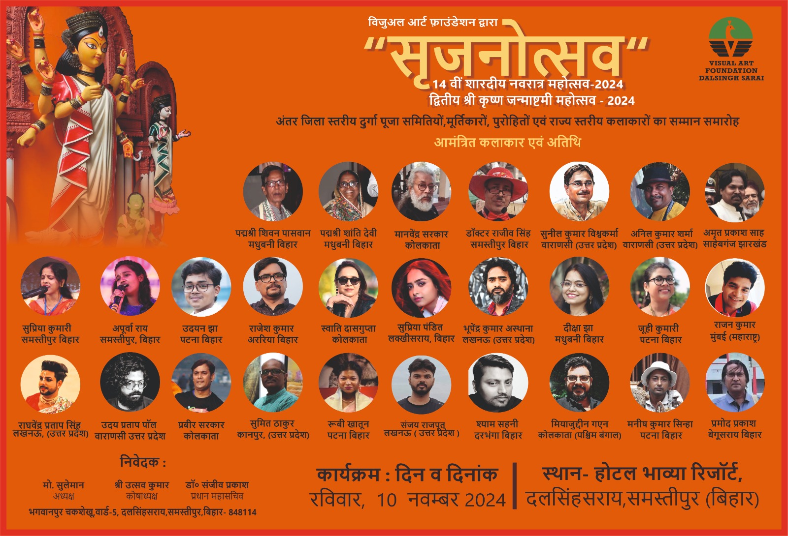 फाउंडेशन के अध्यक्ष चित्रकार मो. सुलेमान ने बताया कि प्रत्येक वर्ष की भांति इस वर्ष भी 14 वीं शारदीय नवरात्र महोत्सव एवं द्वितीय श्रीकृष्ण जन्माष्टमी महोत्सव – 2024 में देश भर से सैकड़ों की संख्या में पद्मश्री,चित्रकला, मूर्तिकला ,कला लेखन, फिल्म, नृत्य,फैशन और संगीत से जुड़े कलाकार लोग शामिल हो रहे हैं।