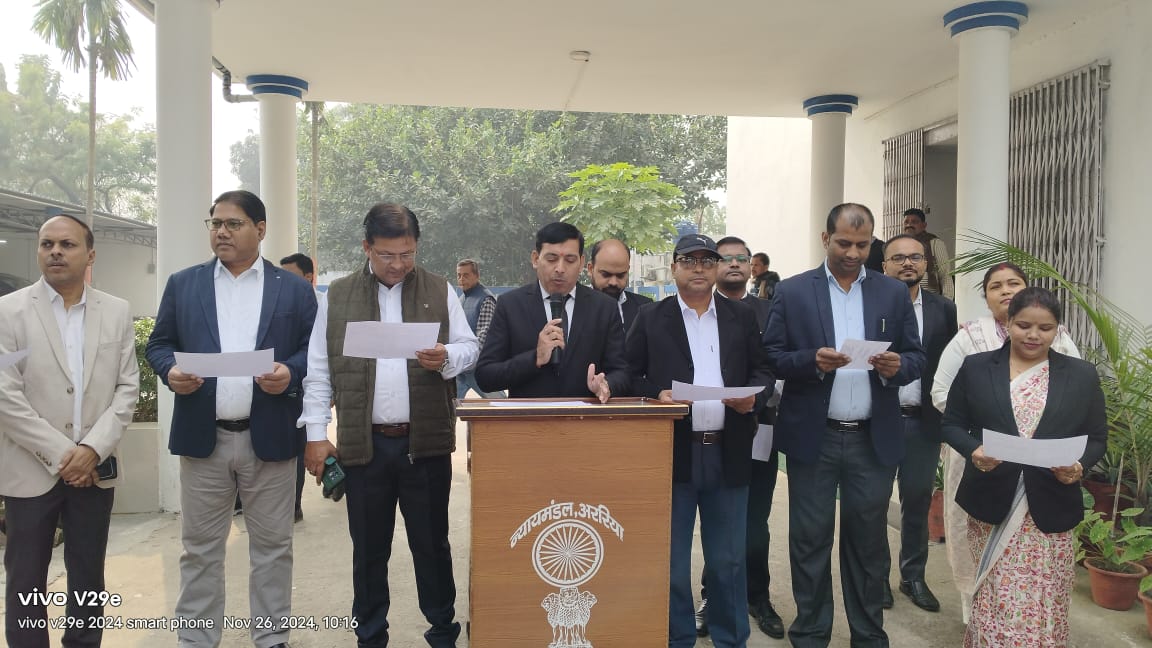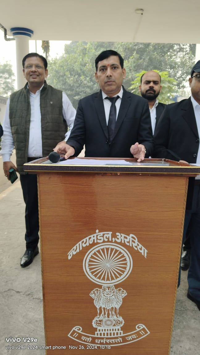 राष्ट्रीय विधिक सेवा प्राधिकरण व बिहार राज्य विधिक सेवा प्राधिकरण के निर्देश के आलोक में मंगलवार को जिला विधिक सेवा प्राधिकरण के तत्वावधान में न्यायमण्डल अररिया परिसर में संविधान दिवस के अवसर पर जिला व प्रथम अपर सत्र न्यायाधीश सह प्रभारी प्रिंसिपल जिला व सत्र न्यायाधीश मनोज कुमार तिवारी की अगुवाई में न्यायिक पदाधिकारियों व कोर्टकर्मियो ने मिलकर संविधान की प्रस्तावना का पठन किया।