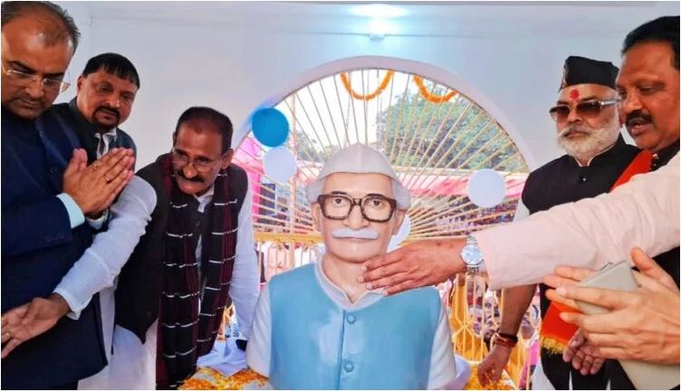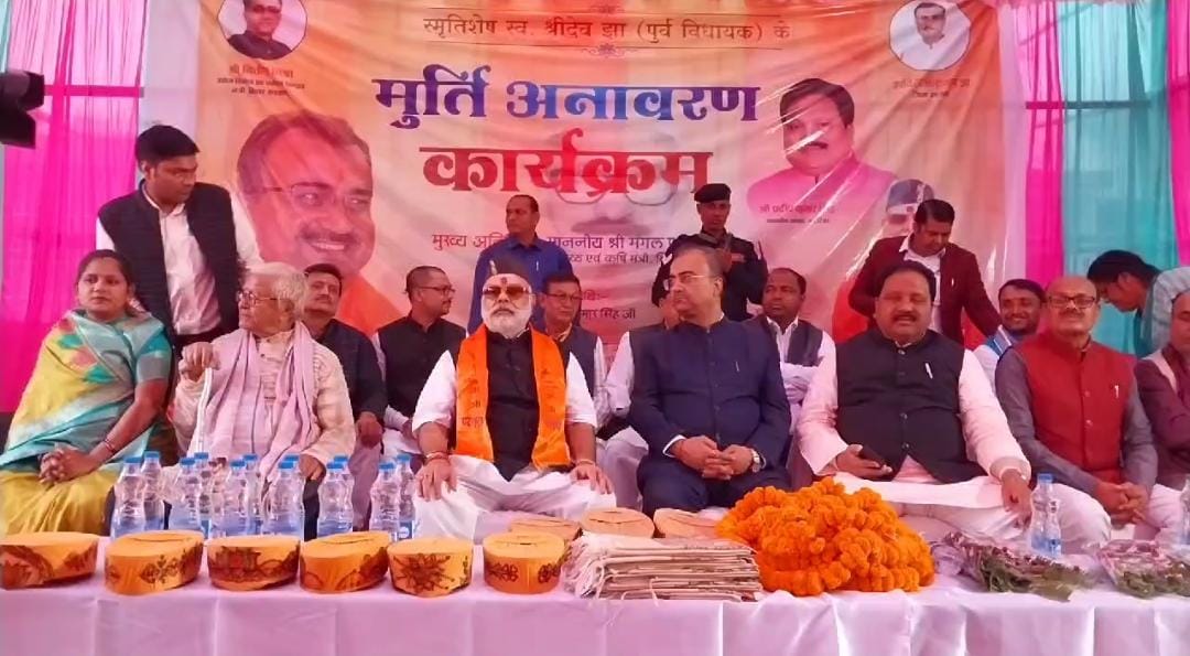 फोटो परिचय : स्व श्रीदेव झा के प्रतिमा का अनावरण करते सूबे के स्वास्थ मंत्री, सांसद व अन्य।