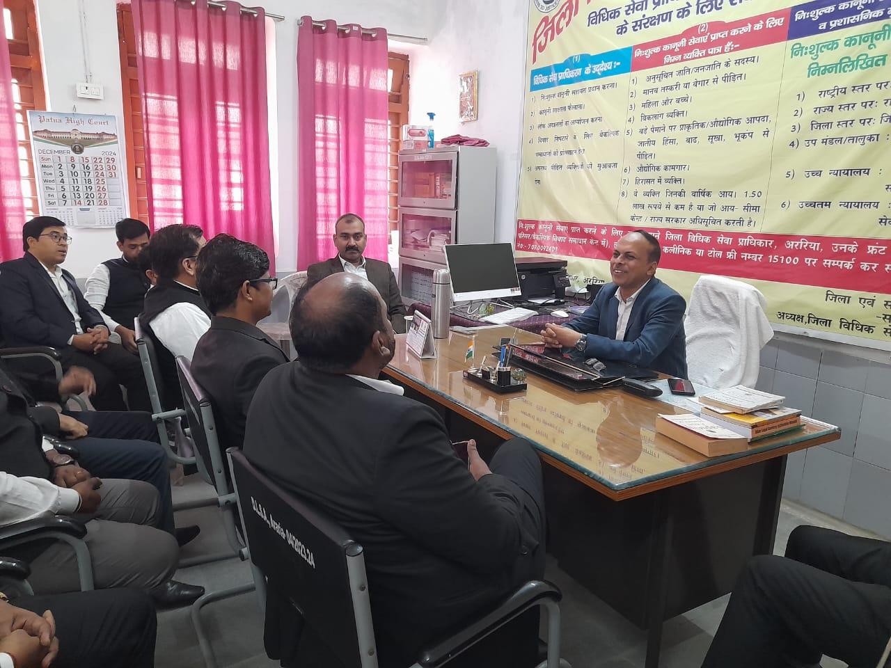 गुरुवार को राष्ट्रीय विधिक सेवा प्राधिकार नई दिल्ली एवं बिहार राज्य विधिक सेवा प्राधिकार पटना के निर्देश के आलोक में 14 दिसंबर 2024 को आयोजित होने वाले राष्ट्रीय लोक अदालत को सफल बनाने के संबंध में श्री रोहित श्रीवास्तव सचिव जिला विधिक सेवा प्राधिकार अररिया की अध्यक्षता में उनके कक्ष में न्यायिक पदाधिकारीयों के साथ बैठक की गई।