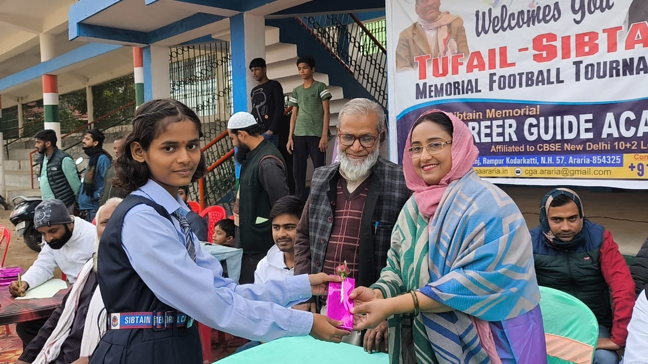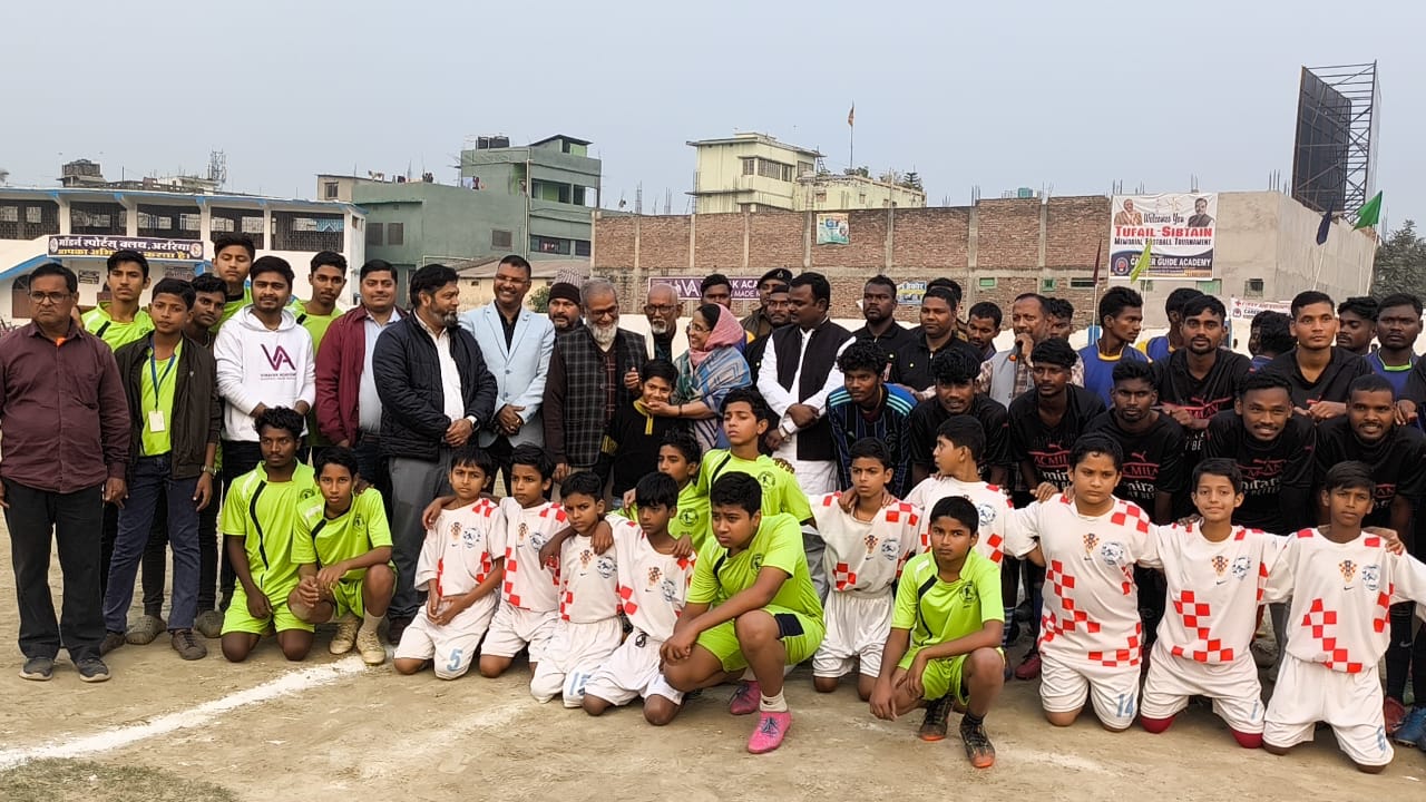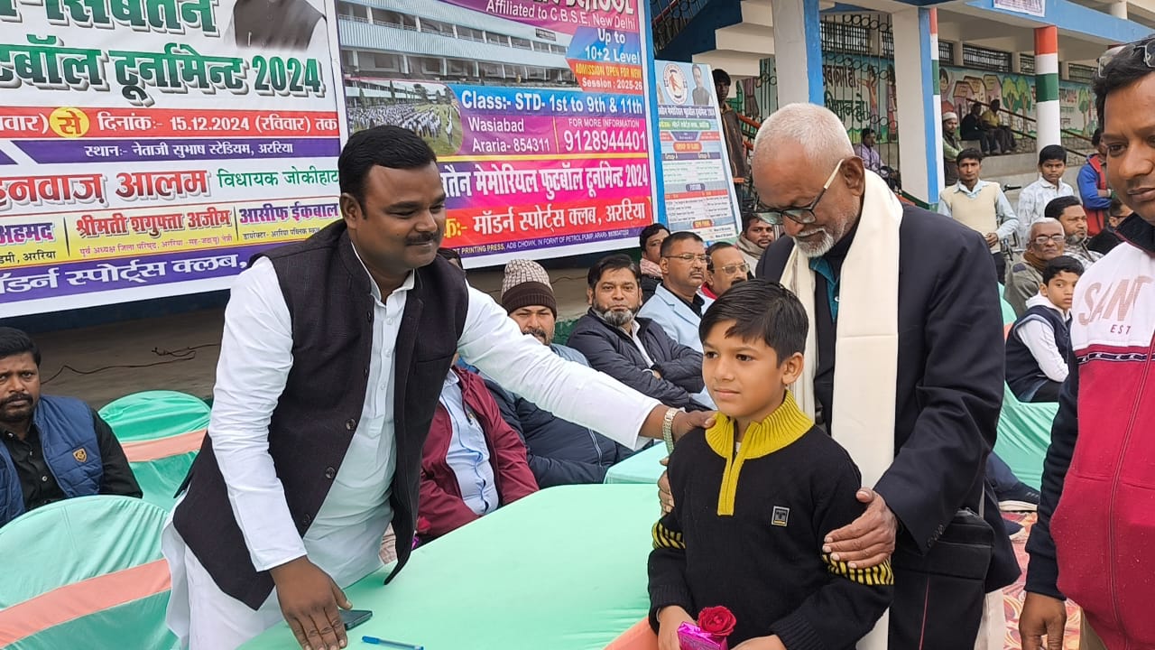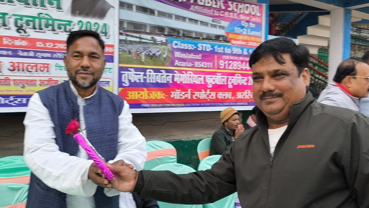 नज़रिया न्यूज़ अररिया। मॉडर्न स्पोर्ट क्लब अररिया के सौजन्य से नेताजी सुभाष स्टेडियम अररिया में सोमवार को तुफैल सिब्तेन मेमोरियल फुटबॉल टूर्नामेंट का उद्घाटन किया गया .जिसमें मुख्य अतिथि के रूप में पूर्व मंत्री सह जोकीहाट विधायक शाहनवाज आलम, पूर्व जिलाध्यक्ष शगुफ्ता अज़ीम और प्रो रकीब अहमद ने खेल का उद्घाटन किया ,बीच मैदान में अतिथियों के साथ परिचित किया गया।