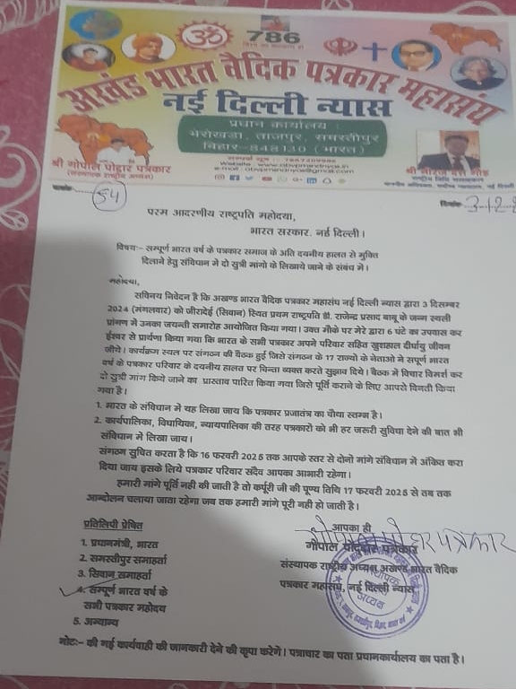 संगठन सुचित करता है कि 16 फरवरी 2025 तक आपके स्तर से दोनो मांगे संविधान से अंकित करा दिया जाय इसके लिये पत्रकार परिवार सदैव आपका आभारी रहेगा।