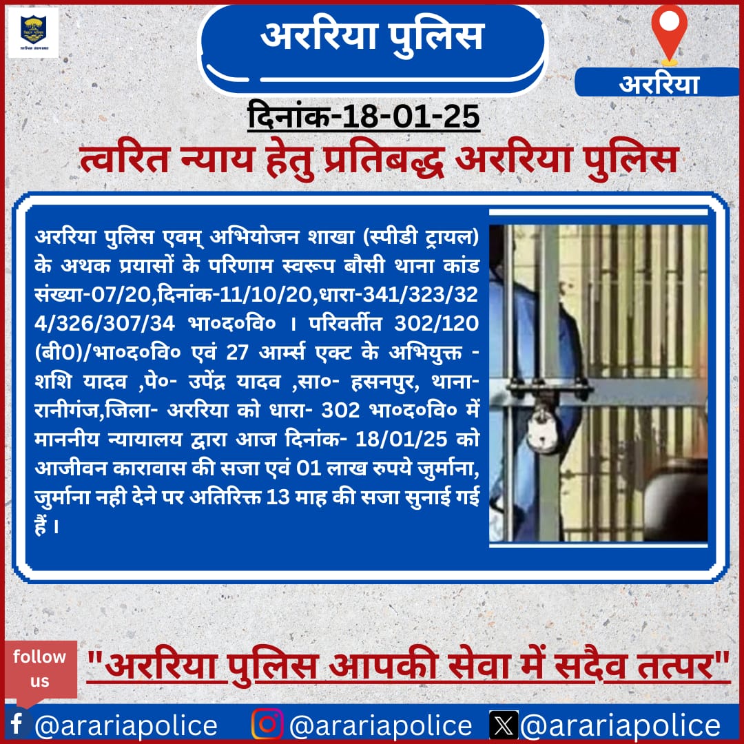 स्पीडी ट्रायल के तहत न्यायमण्डल अररिया के जिला एवं चतुर्थ अपर सत्र न्यायाधीश रवि कुमार की अदालत ने शनिवार को जिले के रानीगंज थाना क्षेत्र के रहनेवाले 45 वर्षीय शशि यादव को आजीवन कारावास की सज़ा सुनाई है।