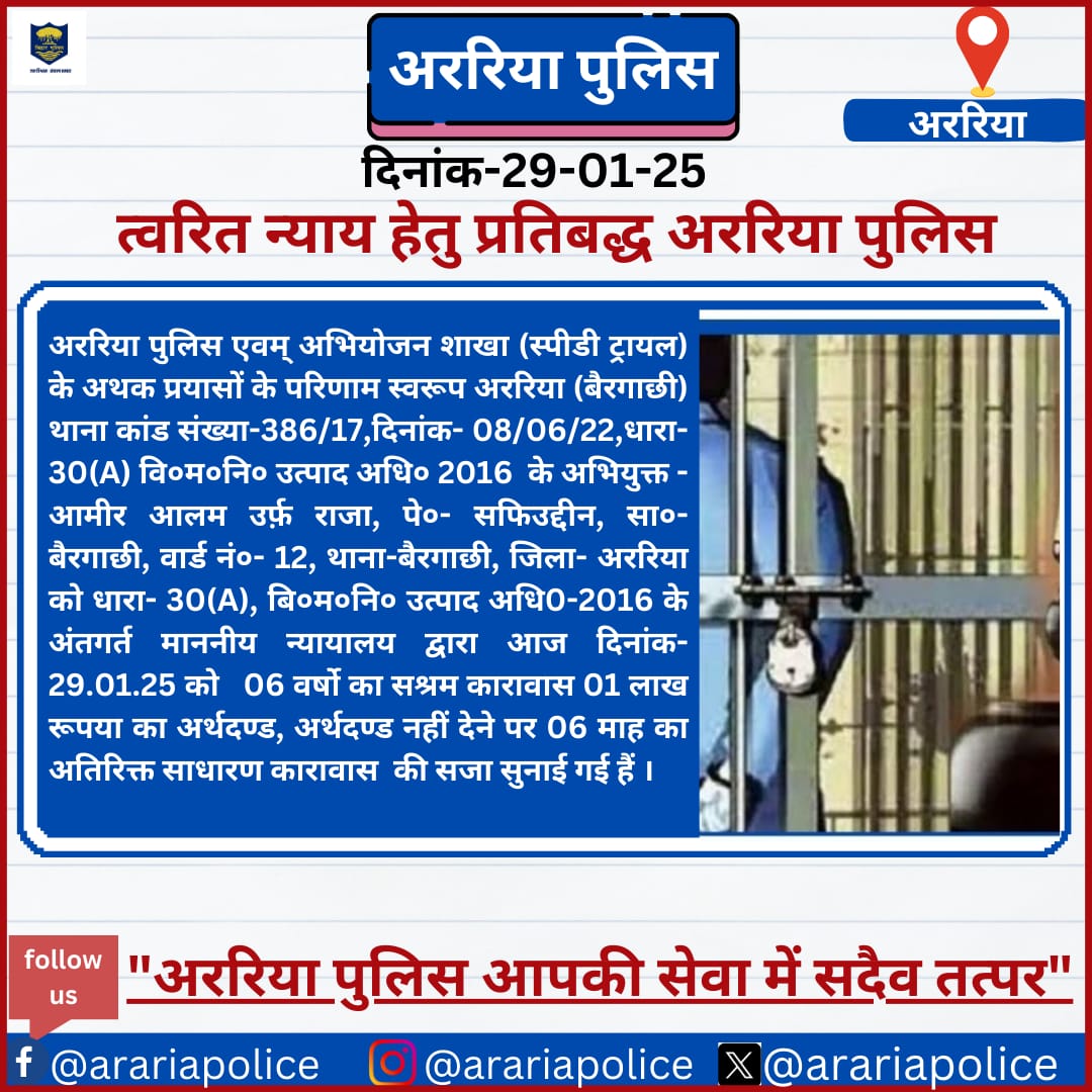 बुधवार को व्यवहार न्यायालय अररिया के जिला व अपर सत्र न्यायाधीश सह एक्साइज-01 कोर्ट के स्पेशल जज राजीव रंजन सिंह की अदालत ने प्रतिबंधित 221.500 लीटर कोडिंयुक्त कफ सिरप बरामदगी का मामला प्रमाणित होने पर बैरगाछी थाना क्षेत्र के वार्ड 12 के रहनेवाले आमिर आलम उर्फ राजा को 06 वर्ष सश्रम कारावास की सज़ा सुनाई है।