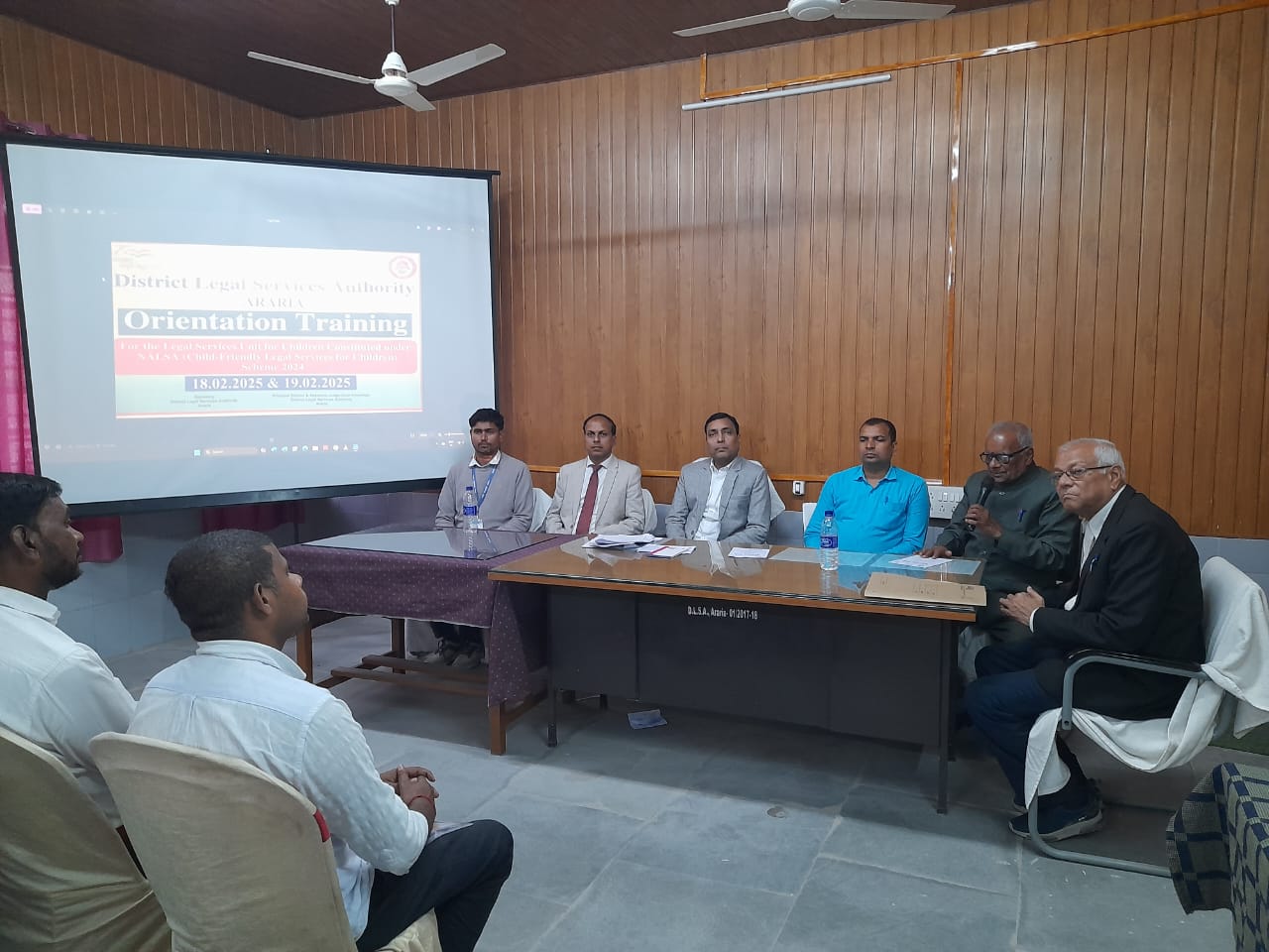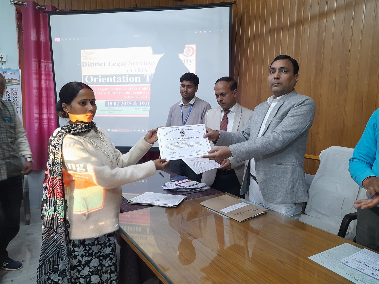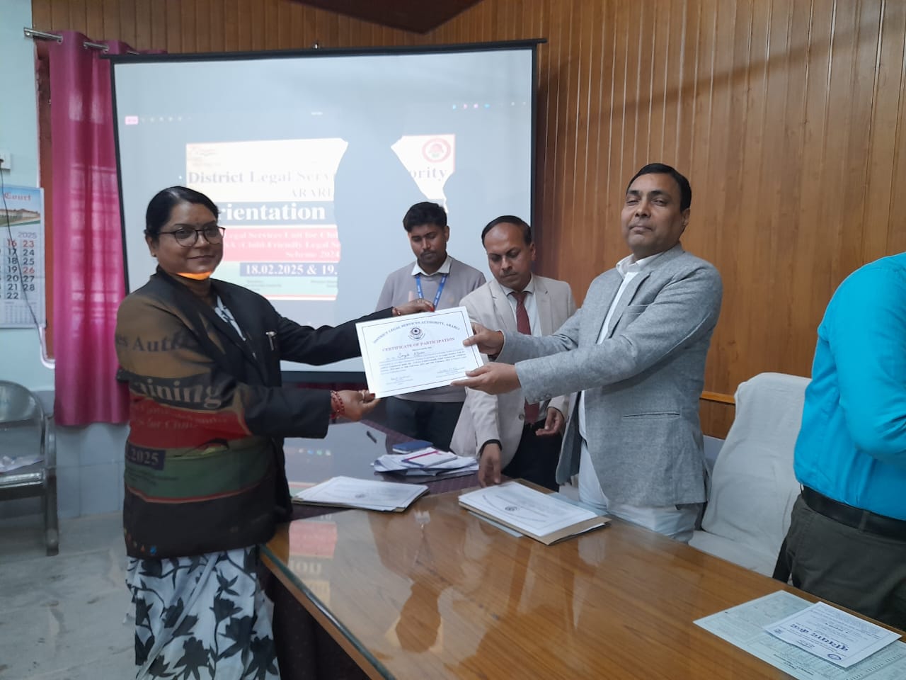 प्रधान जिला एवं सत्र न्यायाधीश सह अध्यक्ष जिला विधिक सेवा प्राधिकार, अररिया श्री गुंजन पाण्डे के द्वारा नालसा (चाइल्ड फ्रेंडली लीगल सर्विसेज) योजना, 2024 एवं नालसा (मानसिक रूप से बीमार और मानसिक रूप से विकलांग व्यक्तियों के लिए कानूनी सेवाएं) योजना 2024 के तहत दो दिवसीय प्रशिक्षण कार्यक्रम के सफलता पूर्वक समापन के बाद कार्यक्रम में भाग लेने वाले डिप्युटी चीफ एल0ए0डी0सी0 , पैनल अधिवक्ताओं एवं पारा विधिक स्वयं सेवकों को प्रशिक्षण प्रमाण-पत्र प्रदान किया गया।