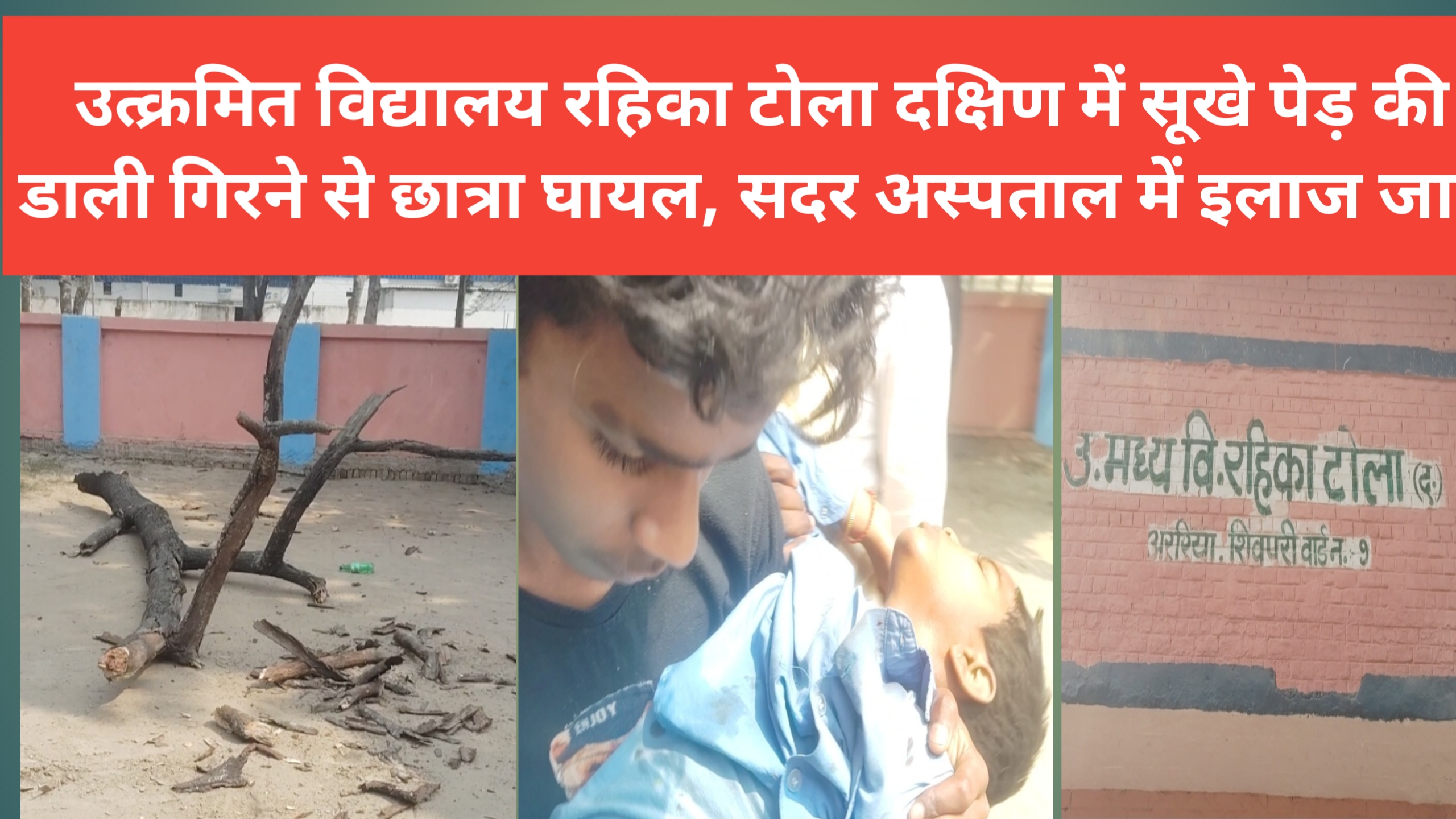 अररिया जिले के उत्क्रमित विद्यालय रहिका टोला दक्षिण में एक दर्दनाक घटना घटी, जहां मध्यान भोजन के दौरान स्कूल कैंपस में खेल रही एक तीन क्लास की छात्रा विद्या कुमारी सूखे पेड़ की डाली गिरने से बुरी तरह घायल हो गई।