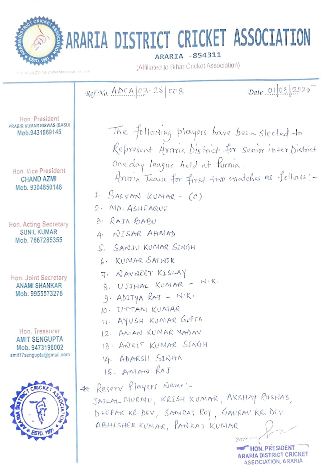 3. अररिया जिला क्रिकेट संघ की 15 सदस्यों की टीम की घोषणा: अररिया जिला क्रिकेट संघ के चयन समिति ने 15 सदस्यों की टीम की घोषणा कर दी गई है, जिसमें सरवन कुमार कप्तान, मो.असफाक, राजा बाबू, संजू सिंह, निसार अहमद, कुमार सात्विक, नवनीत किशलय, उज्जवल कुमार, उत्तम कुमार, आयुष कुमार गुप्ता, आदित्य राज, अंकित कुमार सिंह, अमन कुमार यादव, आदर्श सिन्हा शामिल हैं।
