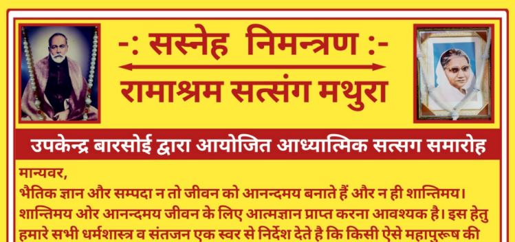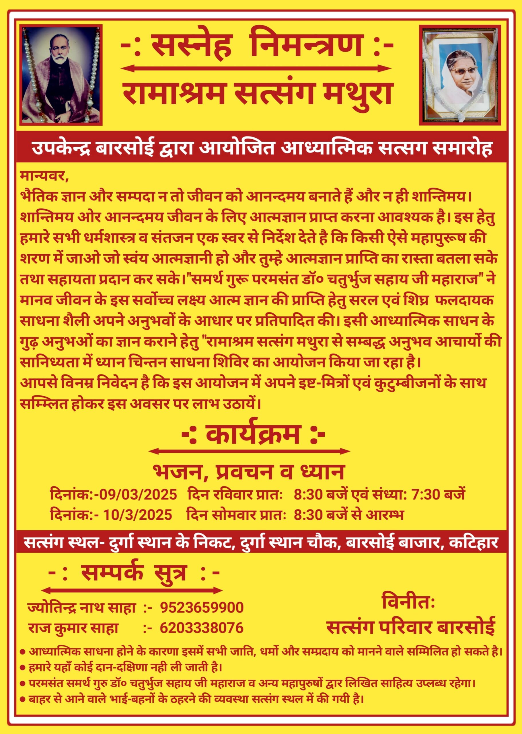 नजरिया संवाददाता बारसोई कटिहार। रामाश्रम सत्संग मथुरा उप केंद्र बारसोई का सत्संग 9 मार्च और 10 मार्च को होने जा रहा है। जिसको लेकर तैयारी जोर-शोर से चल रही है। इस संबंध में बारसोई सत्संग के संचालक राजकुमार साह ने बताया कि हमारे सत्संग के वयोवृद्ध आचार्य पूज्य सिद्धेश्वर प्रसाद भोला चाचा जी और स्थानीय आचार्य विनोद प्रसाद जी के द्वारा बारसोई सत्संग के लिए तीन शाम 9 मार्च को सुबह पहली सीटिंग शाम को दूसरी सीटिंग और 10 मार्च को सुबह की सीटिंग के बाद सत्संग के समापन का समय दिया गया है। उसी अनुसार तैयारी हो रही है। बता दें की प्रमंडल के सभी जिले अररिया, पूर्णिया ,कटिहार इत्यादि से सत्संगी आएंगे उनके रहने ठहरने की व्यवस्था भी की जा रही है। जबकि स्थानीय लोगों के सत्संग में भाग लेने की व्यवस्था हो रही है। इस संबंध में आचार्य विनोद बाबू ने बताया कि रामाश्रम सत्संग में किसी प्रकार के जाति और समुदाय का बंधन नहीं है।