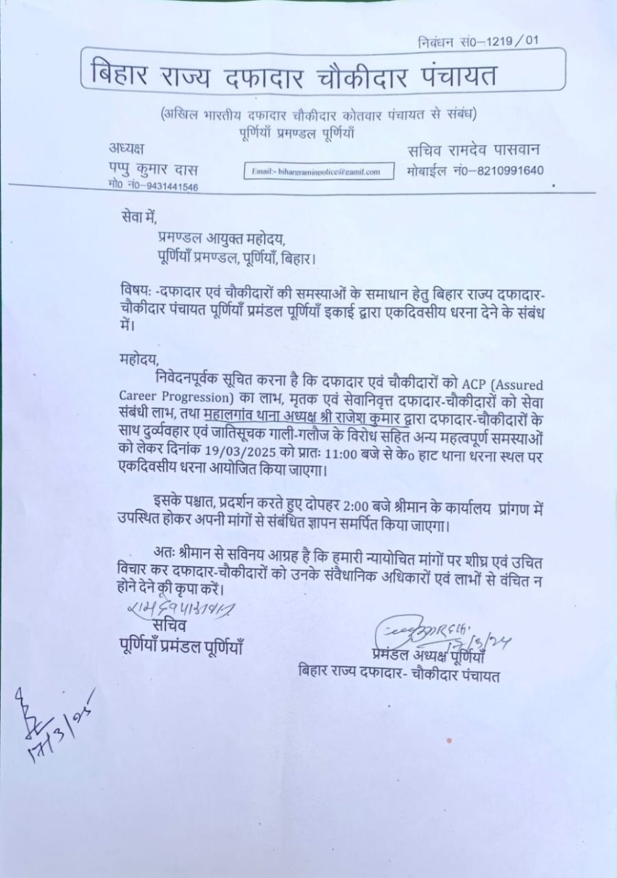 नजरिया न्यूज़ अररिया। महलगांव थाना अध्यक्ष राजेश कुमार पर जातिसूचक गालियों और दुर्व्यवहार का आरोप लगाते हुए उनके खिलाफ कार्रवाई की बिहार राज्य दफादार-चौकीदार पंचायत, पूर्णिया प्रमंडल इकाई ने मांग की है। संगठन ने घोषणा की है कि इस मुद्दे को लेकर 19 मार्च को पूर्णिया के के० हाट थाना धरना स्थल पर एक दिवसीय प्रदर्शन किया जाएगा। पूर्णिया प्रमंडल के सचिव रामद्रव पासवान ने बताया कि इस मामले को लेकर पूर्णिया आयुक्त को आवेदन दिया गया है।