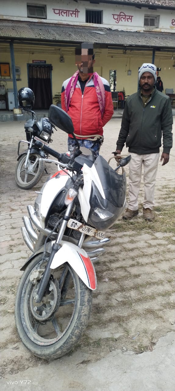 नजरिया न्यूज, पलासी। एकबार फिर से पलासी में पदस्थापित पुअनि कनकलता को पलासी थानाध्यक्ष का प्रभार मिलते ही अपराधियों में हड़कंप मच गया गया है। थानाध्यक्ष का प्रभार मिलते ही कनकलता ने शराब कारोबारियों और बाइक चोरों पर कार्रवाई शुरू कर दी। सोमवार की रात्रि में पलासी के प्रभारी थानाध्यक्ष कनकलता ने दलबल के साथ छापेमारी कर अलग अलग मामलों में कुल तीन लोगों को गिरफ्तार कर न्यायिक हिरासत में भेज दिया है। मिली जानकारी के अनुसार सोमवार की रात्रि में छापेमारी कर चोरी एक टीभीएस अपाची बाइक बरामद किया। साथ ही बाइक चोर तबरेज पिता बदरुज्जमा, सा०-डेहटी, वार्ड नं० 04, थाना पलासी को गिरफ्तार भी किया गया।