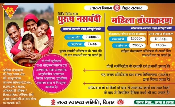 जिसपर स्वास्थ्य विभाग काफ़ी गंभीर है। आशा क़ो लोगों क़ो घर घर जाकर इसपर जागरूक करने क़ो कहा गया है। वहीं सभी स्वास्थ्य केंद्र पर कॉउंसलर से परामर्श लिया जा सकता है। अस्थायी संसाधनों के लिए महिला व पुरुष बास्केट ऑफ च्वाइस की मदद ले सकते है।