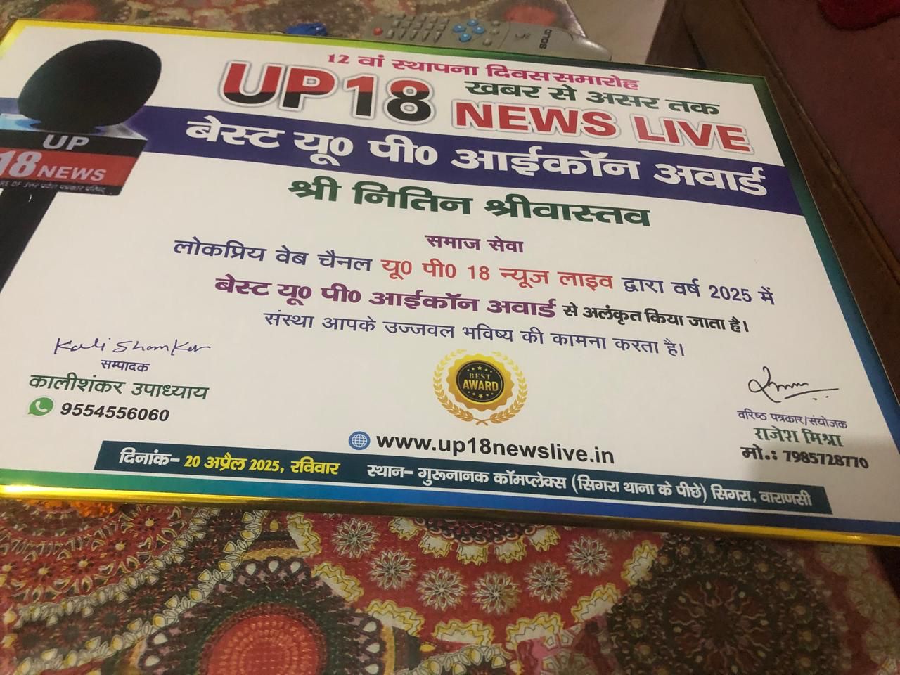 बाबू राम लाल मेमोरियल ट्रस्ट के अध्यक्ष रमेश कुमार श्रीवास्तव और नितिन श्रीवास्तव को उनके समाज सेवा कार्यों के लिए बेस्ट यूपी आइकन अवार्ड से सम्मानित किया गया है।