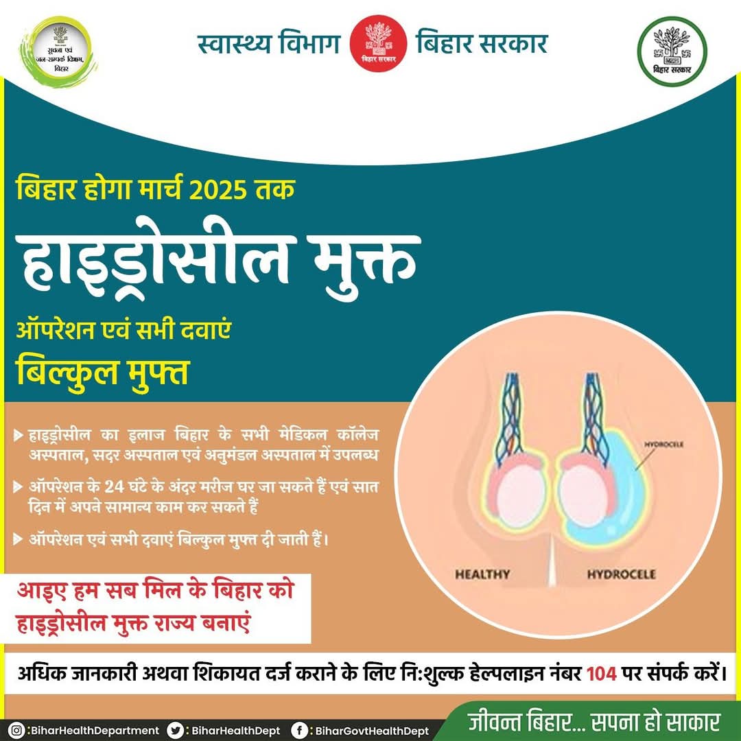 बेतिया। फाइलेरिया एक गंभीर रोग है जिसके कारण समान्यतः लोगों में हाथी पाँव के लक्षण दिखाई पड़ते है। परन्तु इसमें कई प्रकार के लक्षण दिखाई देते है। कुछ पुरुषो में हाइड्रोसील बड़ा, सूजन होना जैसे लक्षण दिखाई देते है तो स्त्रियों में स्तन एवं जननांग भी असामान्य हो जाते है। इसमें सूजन हो जाता है। हाइड्रोसील फाईलेरिया एक ऐसा रोग है जिसकी सर्जरी कर मरीजों क़ो ठीक किया जा सकता है। जिसके लिए लोगों क़ो जागरूक होने की जरूरत है। इस सम्बन्ध में जिले के डीभीडीसीओ डॉ हरेंद्र कुमार ने बताया की जिले के 747 हाइड्रोसील फाईलेरिया मरीजों की सर्जरी हो चुकी है। जिले के जीएमसीएच बेतिया, अनुमण्डलीय अस्पताल नरकटियागंज एवं बगहा मे इसका निःशुल्क ऑपरेशन होता है जिसका लाभ उठाना चाहिए।