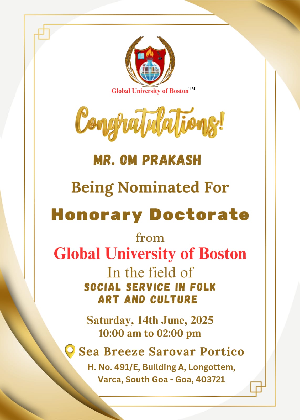 गौरतलब है कि ग्लोबल यूनिवर्सिटी ऑफ बोस्टन विभिन्न क्षेत्रों में उत्कृष्ट योगदान देने वाले व्यक्तियों को हर साल अंतरराष्ट्रीय स्तर पर सम्मानित करती है। इस बार भारत से चुने गए लोक कलाकारों में ओम प्रकाश सोनू का नाम प्रमुख है, जो बिहार के लिए गर्व की बात है।