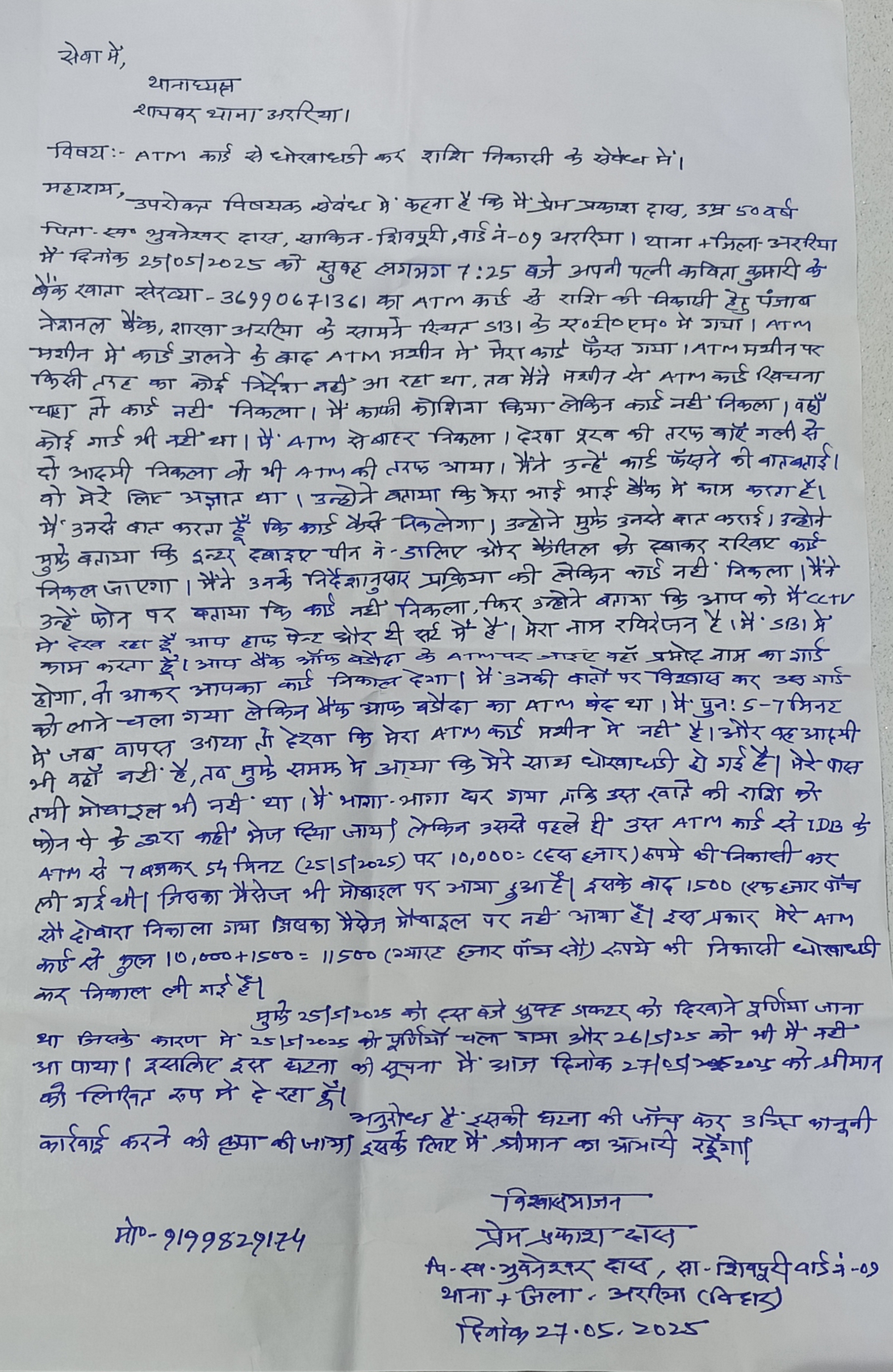 जिले के शिवपुरी, वार्ड नं-9 निवासी प्रेम प्रकाश दास के साथ एटीएम धोखाधड़ी की बड़ी वारदात सामने आई है। घटना 25 मई की सुबह करीब 7:25 बजे की है, जब पीड़ित अपनी पत्नी कविता कुमारी के बैंक खाते से पैसे निकालने के लिए पंजाब नेशनल बैंक, शाखा अररिया के सामने स्थित स्टेट बैंक ऑफ इंडिया (SBI) के एटीएम में पहुंचे।