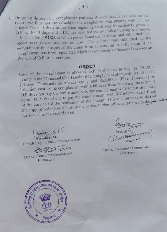 इससे पहले बजाज एलाइंस जनरल इंश्योरेंस लिमिटेड के द्वारा अपने एजेंट को किशनगंज कचरी परिसर बाइक चोरी स्थल में जांच करवाई गई थी। बजाज कंपनी के पटना हेड ऑफिस को 90 दिनों के अंदर वाद का निष्पादन करना था।