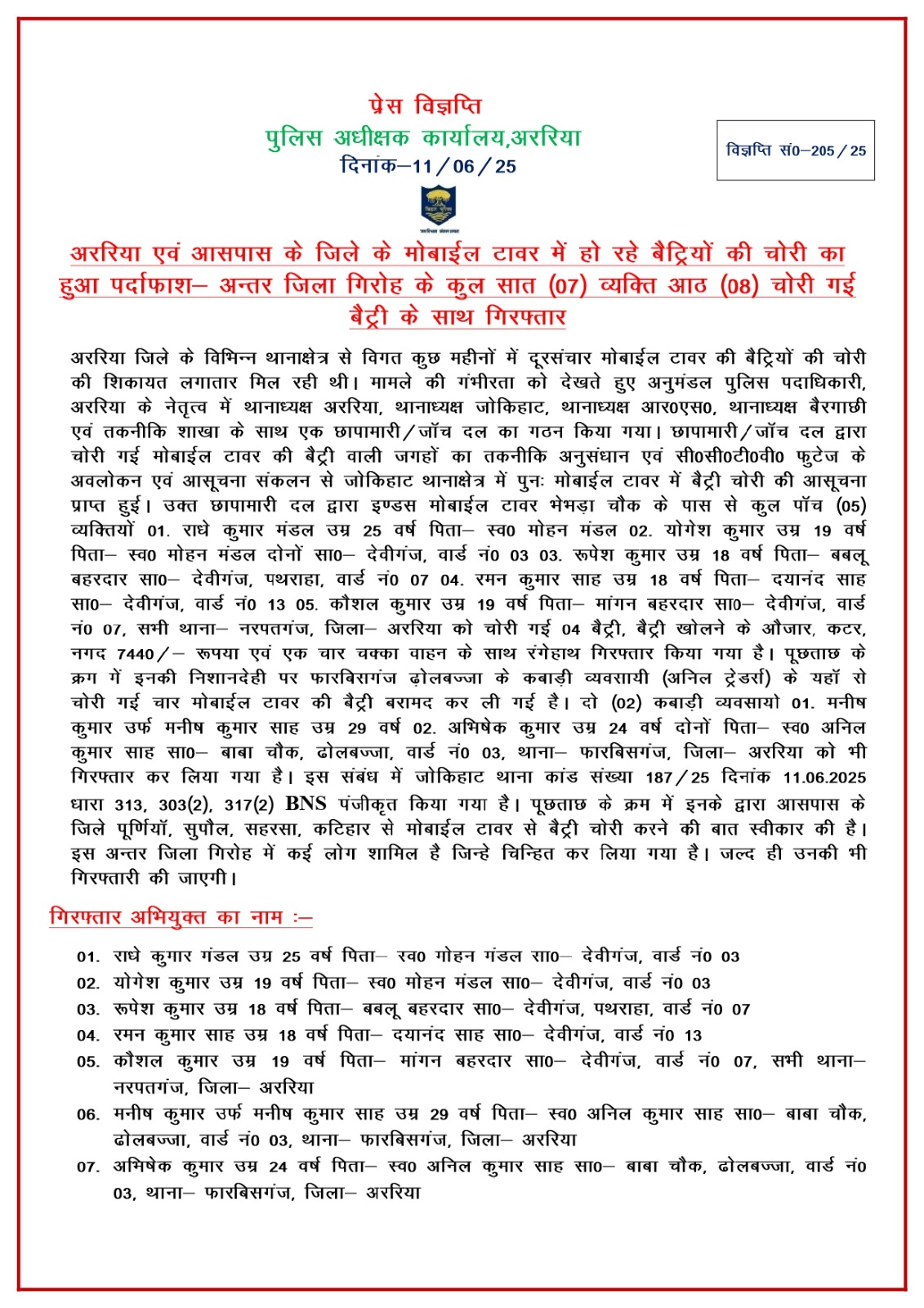 अररिया जिले में लगातार हो रही मोबाइल टावर की बैट्री चोरी की घटनाओं ने पुलिस प्रशासन की चिंता बढ़ा दी थी। इन घटनाओं के पीछे संगठित आपराधिक गिरोह की आशंका जताई जा रही थी। मामले की गंभीरता को देखते हुए अनुमंडल पुलिस पदाधिकारी (एसडीपीओ) अररिया के नेतृत्व में एक विशेष छापामारी व जाँच दल का गठन किया गया, जिसमें अररिया, जोकिहाट, आरएस, बैरगाछी थानों के थानाध्यक्षों के साथ तकनीकी शाखा के अधिकारी शामिल थे।