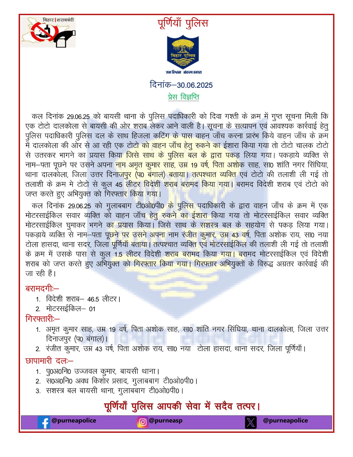 पकड़े गए व्यक्ति की पहचान अमृत कुमार साह (उम्र 19 वर्ष), पिता अशोक साह, निवासी शांति नगर सिंधिया, थाना दालकोला, जिला उत्तर दिनाजपुर (पश्चिम बंगाल) के रूप में हुई। टोटो की तलाशी लेने पर उसमें से कुल 45 लीटर विदेशी शराब बरामद की गई। शराब और टोटो को जब्त करते हुए अभियुक्त को मौके पर ही गिरफ्तार कर लिया गया।