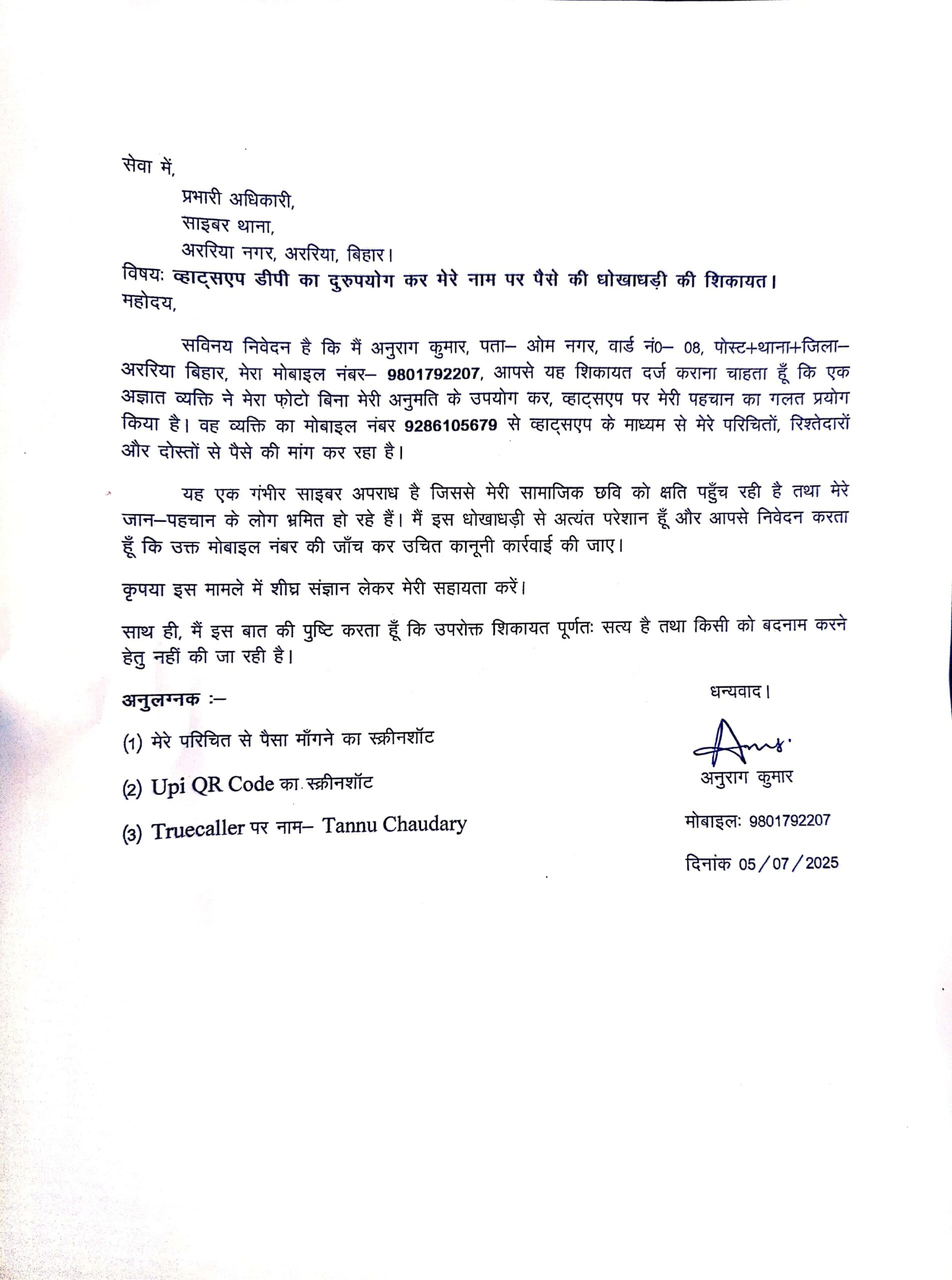 नजरिया न्यूज,अररिया। ओमनगर, वार्ड नं-08 निवासी अनुराग कुमार ने एक अज्ञात व्यक्ति द्वारा उनकी फोटो का दुरुपयोग कर फर्जी व्हाट्सएप आईडी बनाकर लोगों से पैसे मांगने का गंभीर आरोप लगाया है। उन्होंने इस संबंध में संबंधित थाने में लिखित शिकायत दर्ज कराई है।