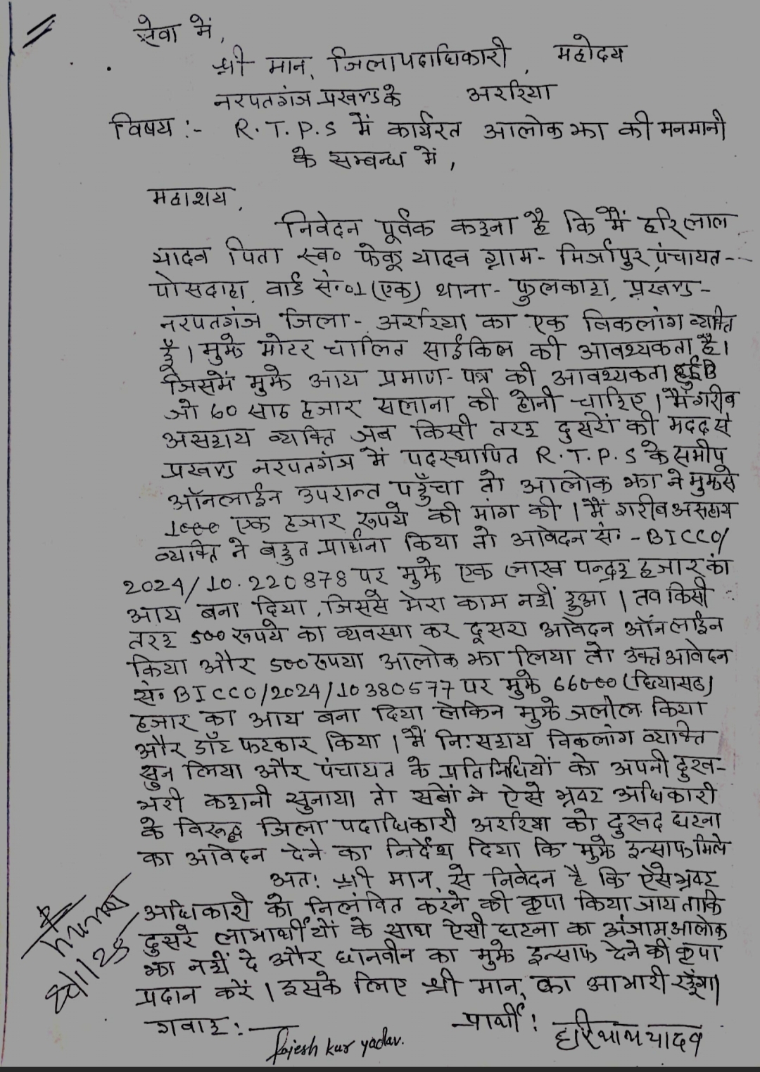 हरिलाल यादव ने आरोप लगाया कि उन्होंने सरकार द्वारा दी जाने वाली दिव्यांग मोटरसाइकिल योजना के लिए वार्षिक आय प्रमाण पत्र की आवश्यकता के तहत आरटीपीएस केंद्र पर आवेदन किया था। परंतु सहायक आलोक झा ने जानबूझकर उनकी वार्षिक आय 1,15,000 दर्शा दी, जिससे वे योजना के लाभ से वंचित हो गए। आवेदन में आगे कहा गया है कि जब उन्होंने प्रमाण पत्र में सुधार की मांग की तो उन्हें पुनः आवेदन देने को कहा गया।