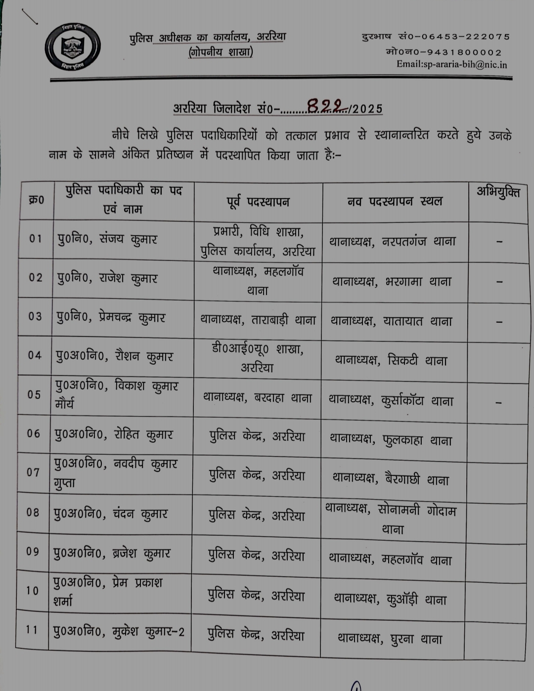अररिया जिले में कानून-व्यवस्था को सुदृढ़ बनाने और खाली पड़े पदों पर बहाली सुनिश्चित करने के लिए मंगलवार को पुलिस अधीक्षक अंजनी कुमार ने बड़े पैमाने पर थानाध्यक्षों का तबादला किया। इस बदलाव के तहत जिले के 17 थानों में नए थानाध्यक्षों की पोस्टिंग की गई है। आदेश जारी करते हुए एसपी ने सभी पदाधिकारियों को अपने-अपने नव पदस्थापन स्थल पर अविलंब योगदान देने का निर्देश दिया है।