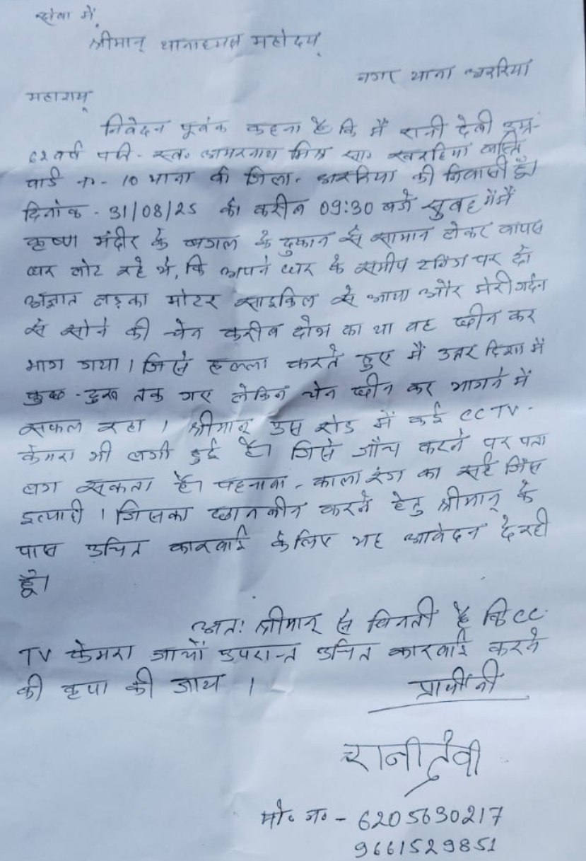 जैसे ही वह अपने घर के समीप मोड़ पर पहुँचीं, तभी मोटरसाइकिल सवार दो अज्ञात युवक वहाँ पहुँचे और उनकी गर्दन से करीब दस भर की सोने की चेन छीनकर फरार हो गए। पीड़िता ने हल्ला मचाते हुए उत्तर दिशा की ओर कुछ दूरी तक पीछा भी किया, लेकिन आरोपी युवक चेन लेकर भागने में सफल रहे।