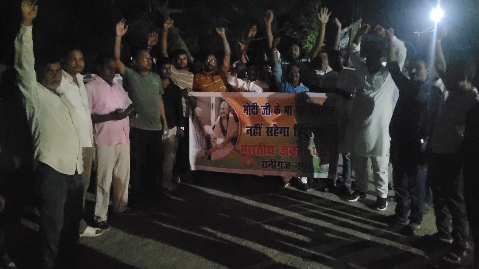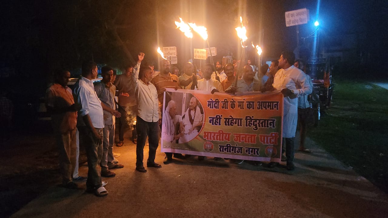 रानीगंज। बिहार बंद के आह्वान को लेकर बुधवार देर शाम सैकड़ों कार्यकर्ताओं ने मशाल हाथ में लेकर मुख्य मार्गों पर जुलूस निकाला। ‘प्रधानमंत्री की माता का अपमान बर्दाश्त नहीं’ जैसे नारों से पूरा इलाका गूंज उठा। मशाल की रोशनी और नारों के शोर से बाजार की फिजा देर रात तक गर्म रही।भाजपा नगर अध्यक्ष सुमन झा ने कहा कि राहुल गांधी और तेजस्वी यादव के मंच से प्रधानमंत्री नरेंद्र मोदी की माता जी के खिलाफ अभद्र भाषा का इस्तेमाल किया गया,