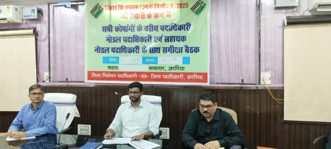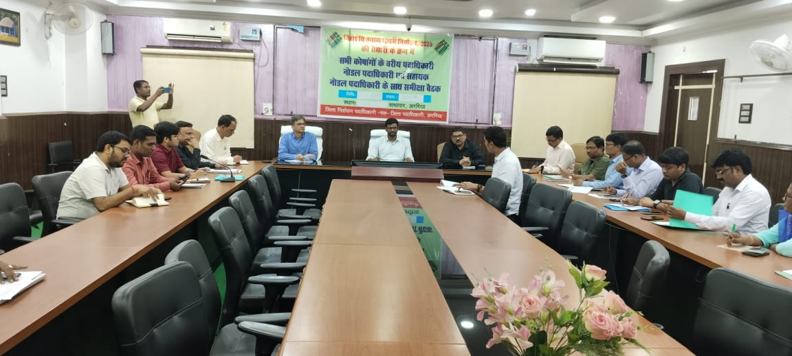 आगामी बिहार विधानसभा आम निर्वाचन 2025 को लेकर अररिया जिला प्रशासन पूरी तरह सक्रिय हो गया है। इसी क्रम में शनिवार को जिला निर्वाचन पदाधिकारी सह जिलाधिकारी श्री अनिल कुमार, भा.प्र.से. की अध्यक्षता में आत्मन कक्ष में एक महत्वपूर्ण समीक्षा बैठक आयोजित की गई। इस बैठक में सभी कोषांगों के वरीय प्रभारी, नोडल पदाधिकारी एवं सहायक नोडल पदाधिकारी शामिल हुए।