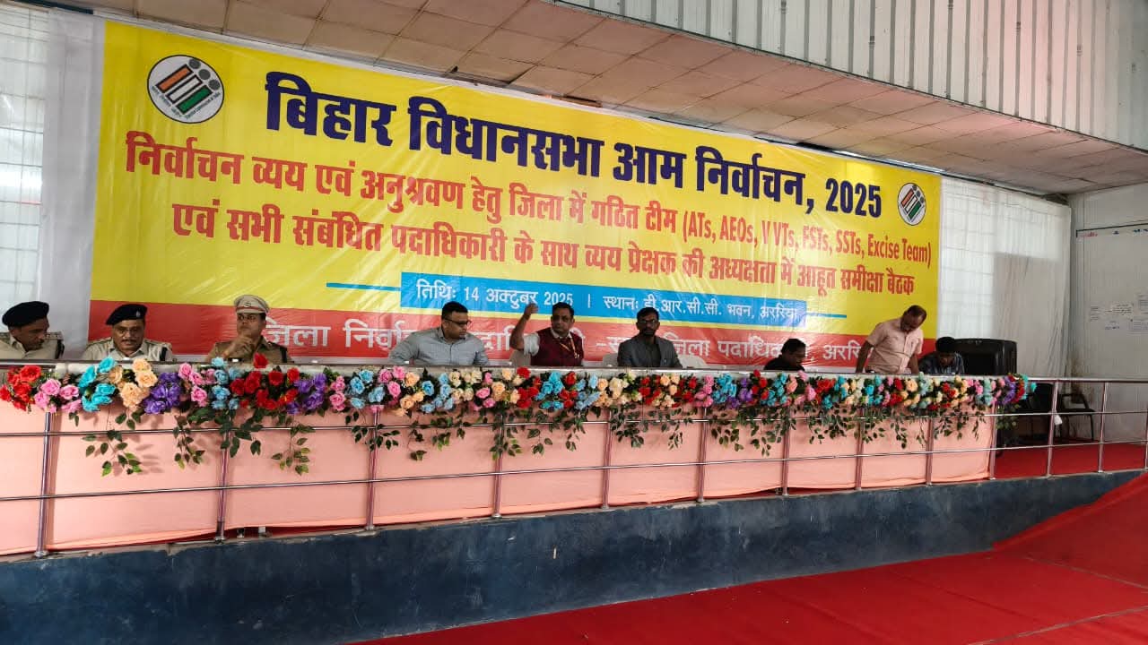 बिहार विधानसभा आम निर्वाचन 2025 के मद्देनज़र निर्वाचन व्यय की निगरानी और पारदर्शिता सुनिश्चित करने हेतु आज व्यय प्रेक्षक श्री आवेश तितरमारे एवं श्री दिनेश जांगिड़ की अध्यक्षता में अररिया जिले में गठित ATs, AEOs, VVTs, FSTS, SSTs, Excise Team एवं सभी संबंधित पदाधिकारी के साथ डीआरसीसी सभागार, अररिया में एक महत्वपूर्ण बैठक आयोजित की गई।