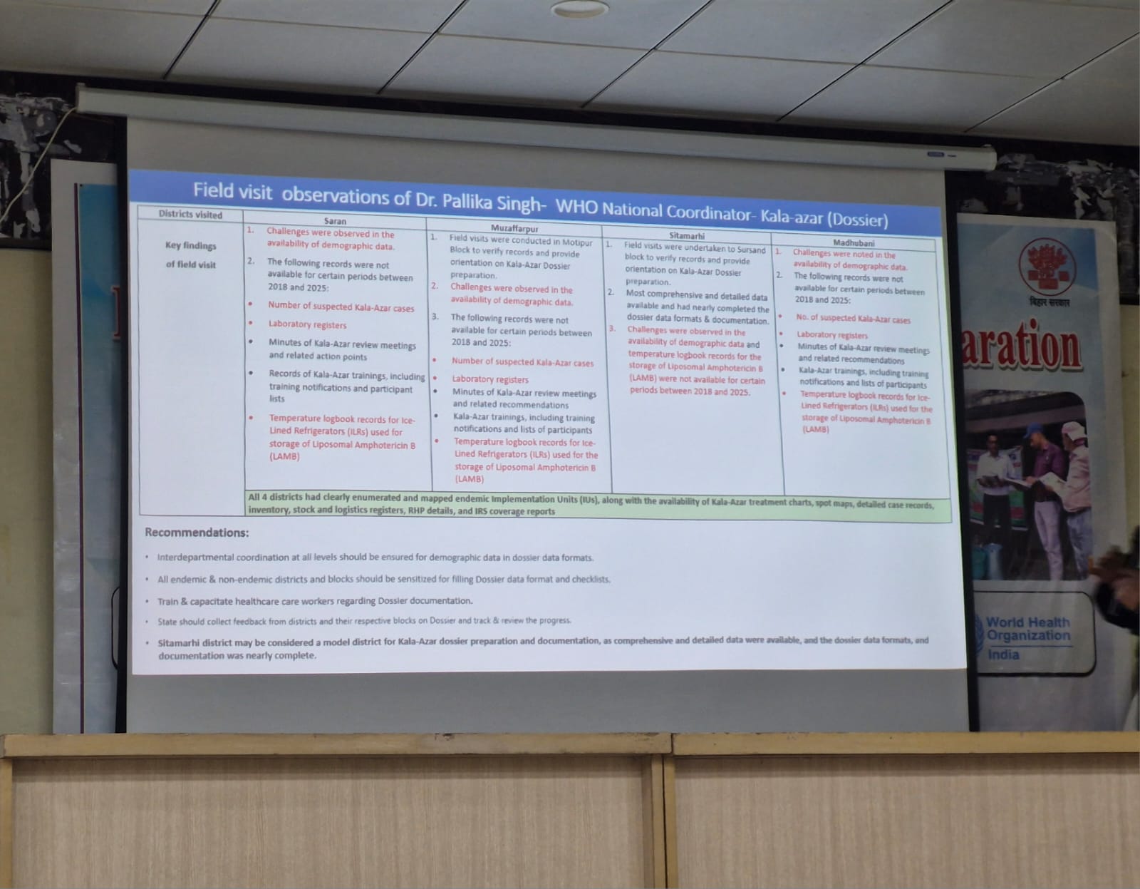 कालाजार उन्मूलन कार्यक्रम में सीतामढी फिर बना माॅडल जिला। यह जानकारी विश्व स्वास्थ्य संगठन के राज्य समन्वयक डॉ राजेश पाण्डेय ने ‘राजेन्द्र मेमोरियल रिसर्च आयुर्विज्ञान संस्थान, पटना के सभागार मे अपने व्याख्यान के दौरान दी। उन्होंने दृश्य-श्रव्य माध्यम से कालाजार उन्मूलन पश्चात डोजियर की तैयारी को लेकर आयोजित सभा मे हाल ही मे विश्व स्वास्थ्य संगठन के राष्ट्रीय समन्वयक डॉ पल्लिका सिंह द्वारा बिहार के विभिन्न जिलों के भ्रमण पश्चात सौंपे गये प्रतिवेदन को दिखाते हुए कहा कि डोजियर की तैयारी सीतामढ़ी मे लगभग पूरी हो गई है और वहाँ सभी दस्तावेज सुसज्जित और सुव्यवस्थित हैं। अन्य जिलों को भी इससे बहुत मदद मिलेगी और इससे बिहार का पूरा डोजियर बनाने मे कामयाबी मिलेगी।