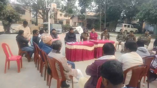 बैठक में पूजा आयोजन, प्रतिमा स्थापना एवं विसर्जन को लेकर विस्तारपूर्वक चर्चा की गई।अधिकारियों ने कहा कि पूजा के दौरान किसी भी प्रकार की अव्यवस्था बर्दाश्त नहीं की जाएगी।थानाध्यक्ष मिथिलेश कुमार ने हुड़दंगियों पर सख्त नजर रखने की बात कही।उन्होंने डीजे पर अश्लील गाना बजाने पर पूर्ण प्रतिबंध लगाने का निर्देश दिया।बीडीओ आदित्य प्रकाश ने कहा कि पूजा आपसी भाईचारे के साथ मनाई जाए।उन्होंने उपस्थित जनप्रतिनिधियों से प्रशासन को सहयोग करने की अपील की।बीडीओ ने कहा कि प्रतिमा विसर्जन निर्धारित मार्ग से ही किया जाए।किसी भी हाल में मार्ग परिवर्तन की अनुमति नहीं होगी।जीप सदस्य सब्बीर अहमद ने विसर्जन के दौरान वोलेंटियर तैनात करने का सुझाव दिया।उन्होंने प्रमुख स्थानों पर सीसीटीवी कैमरा लगाने की बात कही।साथ ही नशीले पदार्थों पर सख्ती से प्रतिबंध लगाने की अपील की।उन्होंने कहा कि पूजा के दौरान सोशल मीडिया की अफवाहों से बचें।किसी भी संदिग्ध सूचना की तत्काल प्रशासन को जानकारी दें इंस्पेक्टर दिनेश कुमार ने कहा कि पुलिस पूरी तरह सतर्क रहेगी।उन्होंने कहा कि असामाजिक तत्वों पर कड़ी कार्रवाई की जाएगी।सीओ सुशीलकांत सिंह ने विधि-व्यवस्था बनाए रखने की अपील की।