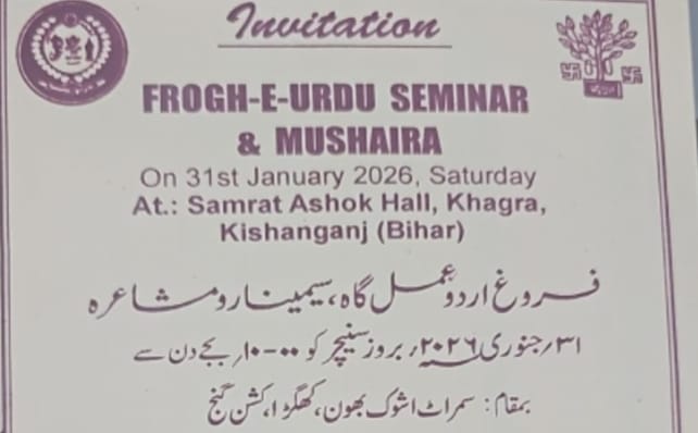 समय: इफत्ता 10 बजे सुबह , मुशायरा 02 बजे शाम से।स्थान सम्राट अशोक भवन, खगड़ा, किशनगंज।आप सभी की तशरीफ़-आवरी हमारे लिए बाइस-ए-इज़्ज़त होगी।