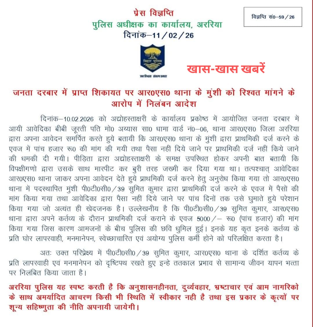 अररिया एसपी कार्यालय से जारी प्रेस नोट के माध्यम से यह जानकारी प्राप्त हुई है कि जनता दरबार में आई एक गंभीर शिकायत के आलोक में आरएस थाना में पदस्थापित मुंशी को रिश्वत मांगने के आरोप में निलंबित कर दिया गया है। यह कार्रवाई दिनांक 10.02.2026 को आयोजित जनता दरबार में प्राप्त आवेदन के आधार पर की गई है।