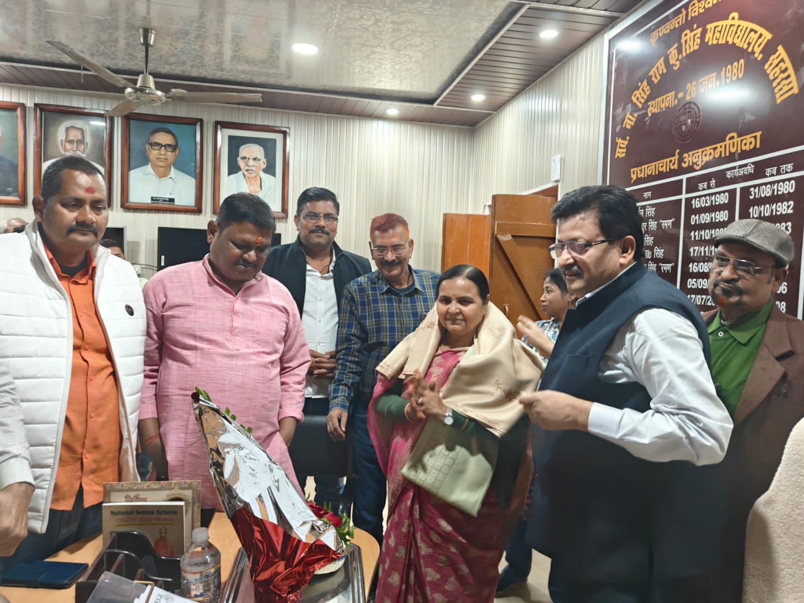सर्व नारायण सिंह रामकुमार सिंह महाविद्यालय, सहरसा में महापौर बैन प्रिया एवं सिंडिकेट सदस्य मेजर डॉ गौतम को प्रधानाचार्य प्रो (डॉ) अशोक कुमार सिंह के द्वारा महाविद्यालय में सम्मानित किया गया। महापौर द्वारा महाविद्यालय का निरीक्षण किया गया। बैन प्रिया ने प्रधानाचार्य से कहा कि महाविद्यालय में सौन्दर्यीकरण के लिए जो भी आवश्यकता हो वह हमें बताएं नगर निगम के द्वारा हर संभव सहयोग किया जाएगा। प्रधानाचार्य के द्वारा मुख्य सड़क से महाविद्यालय तक जर्जर सड़क के निर्माण, मुख्य सड़क पर भव्य गेट का निर्माण ,पश्चिमी परिसर में हाई मास्क लाइट,एक वॉशरूम महिला, पुरुष के लिए , साथ ही मंच का चौडीकरण,के लिए आग्रह किया ,शिक्षक संघ के अध्यक्ष डॉ अनिल कुमार सिंह ने महापौर से मांग किया कि महाविद्यालय से प्रतिदिन कचडा उठाऊ , ट्रॉली एवं डस्टबीन की व्यवस्था हो। महाविद्यालय शिक्षक संघ सचिव डॉ रंजय कुमार सिंह ने मांग किया कि मुख्य सड़क से लेकर महाविद्यालय परिसर तक दोनों ओर स्ट्रीट लाईट की व्यवस्था हो। महापौर बैन प्रिया ने प्रधानाचार्य से कहा कि आप अपनी माँग नगर आयुक्त को या हमारे कार्यालय में दें हम हर संभव पूरा करने का प्रयास करेंगे। प्रधानाचार्य कक्ष में प्रो गौतम कुमार सिंह,डॉ प्रमोद कुमार सिंह, डॉ निर्पेंद्र कुमार सिन्हा,डॉ सैयद रबाब फातिमा,डॉ धर्मव्रत चौधरी, डॉ आर्य सिंधु,डॉ संजय कुमार सिंह ,डॉ अनिरुद्ध कुमार,डॉ सुभाष एवं ओम प्रकाश सिंह के साथ शिक्षक एवं कर्मचारी उपस्थित रहे l