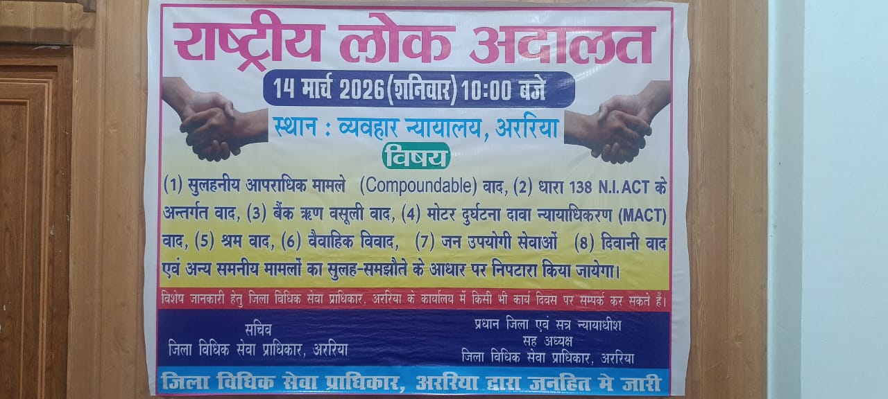 जिला विधिक सेवा प्राधिकरण, अररिया के तत्वाधान में शुक्रवार को व्यवहार न्यायालय परिसर, अररिया में राष्ट्रीय लोक अदालत एवं मेडिएशन फॉर द नेशन विषय पर चर्चा का आयोजन किया गया। इस अवसर पर आपसी सौहार्द और सामाजिक समरसता को बढ़ावा देने के उद्देश्य से होली मिलन समारोह भी आयोजित किया गया।