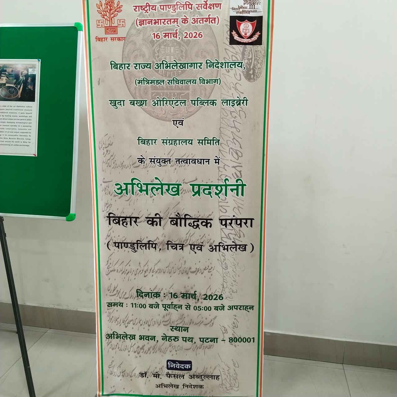 राष्ट्रीय पांडुलिपि सर्वेक्षण (ज्ञानभारतम के अंतर्गत), संस्कृति मंत्रालय, भारत सरकार के द्वारा देशभर में पांडुलिपियों के संरक्षण, संवर्धन एवं उनके महत्व के प्रति जागरूकता बढ़ाने के उद्देश्य से विभिन्न कार्यक्रम संचालित किए जा रहे हैं। इसी क्रम में दिनांक 16 मार्च 2026 को बिहार राज्य अभिलेखागार निदेशालय, खुदाबख्श ओरिएंटल पब्लिक लाइब्रेरी एवं बिहार संग्रहालय के संयुक्त तत्वावधान में “बिहार की बौद्धिक परंपरा : पांडुलिपियाँ, चित्र एवं अभिलेख” विषय पर एक विशेष प्रदर्शनी का आयोजन किया गया।