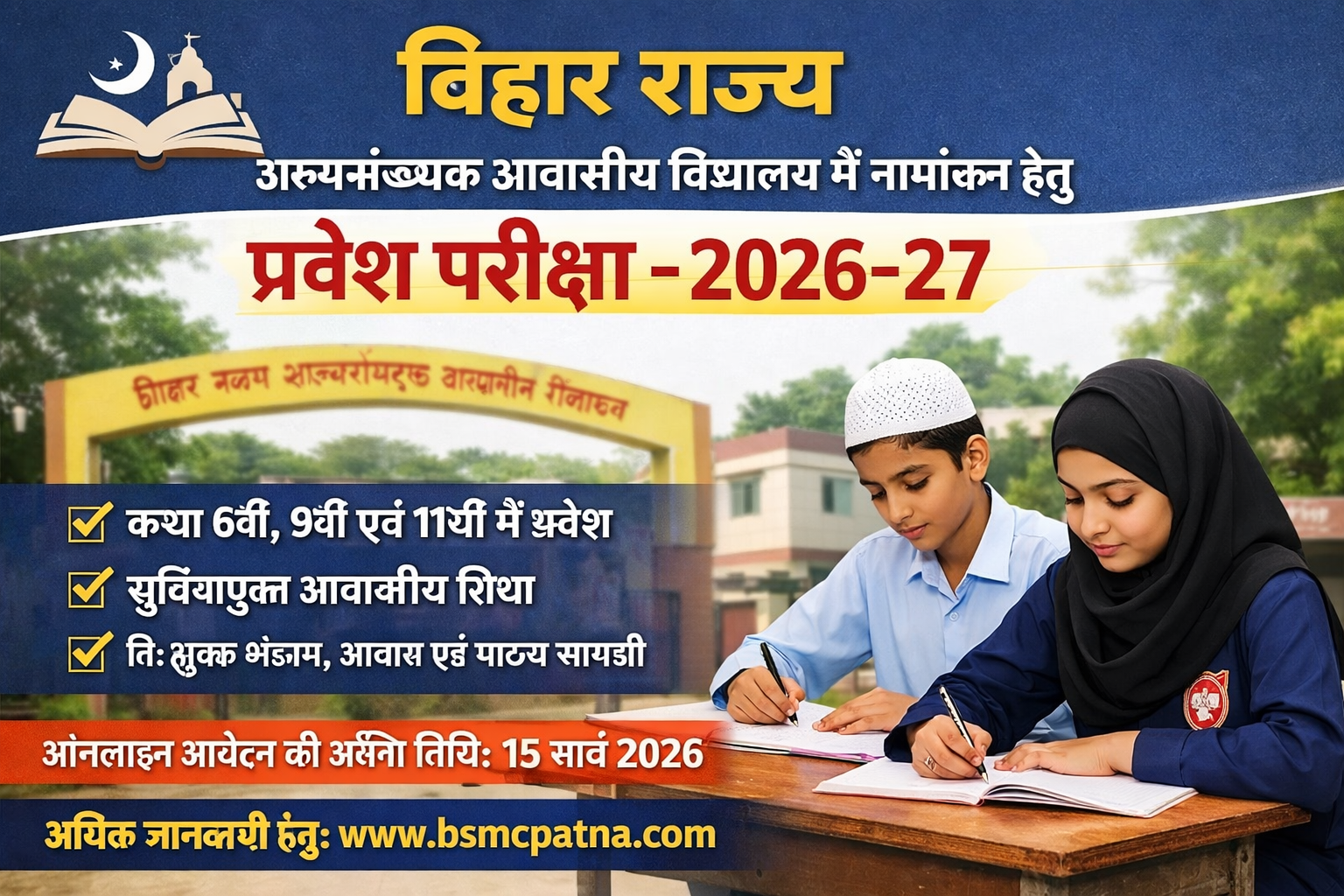 बिहार के निवासित अल्पसंख्यक यथा- मुस्लिम, सिख, ईसाई, बौद्ध, जैन एवं पारसी समुदाय के छात्र/छात्राओं के लिये बिहार राज्य अल्पसंख्यक आवासीय विद्यालय योजनान्तर्गत किशनगंज/दरभंगा जिले में संचालित अल्पसंख्यक आवासीय विद्यालय में शैक्षणिक सत्र- 2026-27 के लिये वर्ग-09 एवं वर्ग-11 में नामांकन हेतु दिनांक-01.04.2026 को परीक्षा केन्द्र +2 राजकीयकृत उच्च विद्यालय, अररिया में प्रवेश परीक्षा का आयोजन 12:00 अपराह्न से 02 बजे अपराह्न तक किया जा रहा है। उक्त परीक्षा में शामिल होने हेतु छात्र/छात्राओं के लिए रिपोर्टिंग टाइम 11:00 बजे पूर्वाहन् निर्धारित है। यह जानकारी सहायक निदेशक अल्पसंख्यक कल्याण अररिया द्वारा दी गई है।