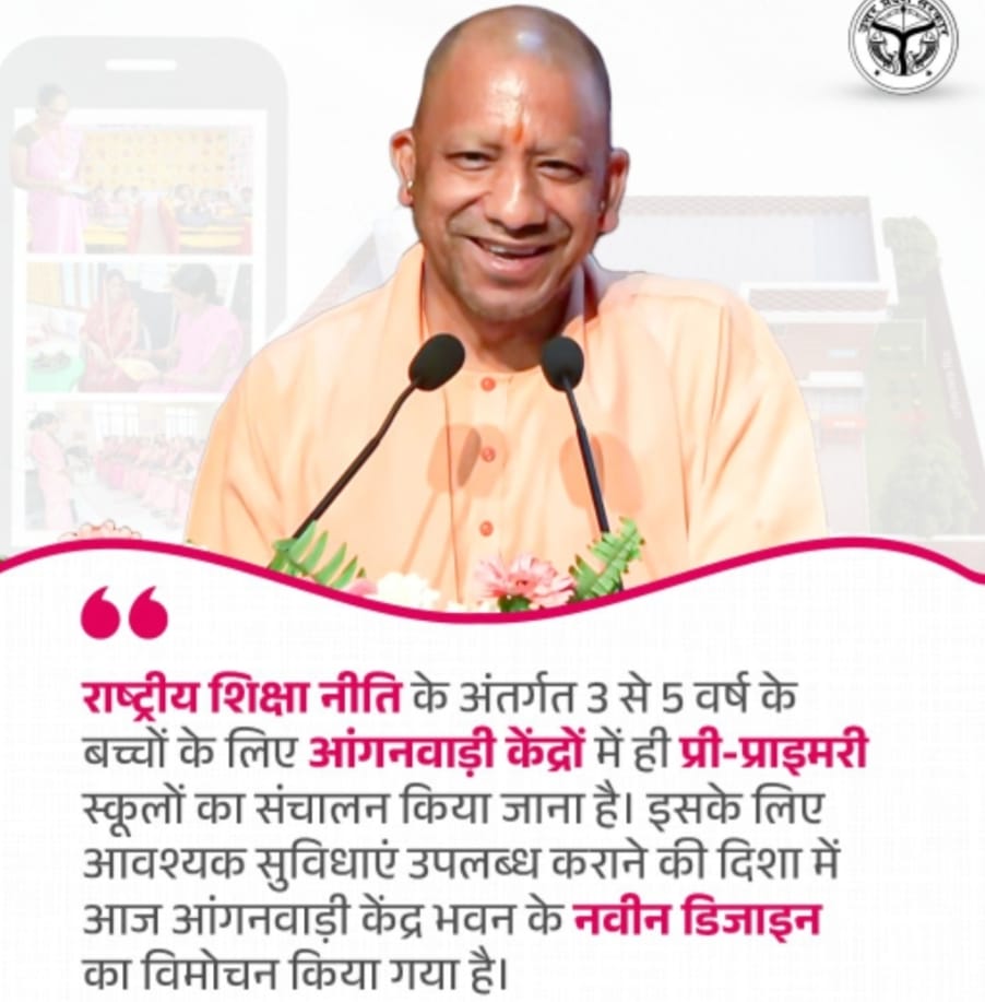 राष्ट्रीय शिक्षा नीति के अंतर्गत 3 से 5 वर्ष के बच्चों के लिए आंगनवाड़ी केंद्रों में ही प्री-प्राइमरी स्कूलों का संचालन किया जाना है। इसके लिए आवश्यक सुविधाएं उपलब्ध कराने की दिशा में आज आंगनवाड़ी केंद्र भवन के नवीन डिजाइन का विमोचन किया गया है। यह बात मुख्यमंत्री योगी आदित्यनाथ ने कही। मुख्यमंत्री योगी आदित्यनाथ लखनऊ में आंगनबाड़ी सेविकाओं और सहायिकाओं सहित उत्तर प्रदेश के विकास यात्रा तथा रोजगार के लिए सरकार के द्वारा की जा रही पहल तथा पूर्ववर्ती सरकारों की नीतियों पर बोल रहे थे।