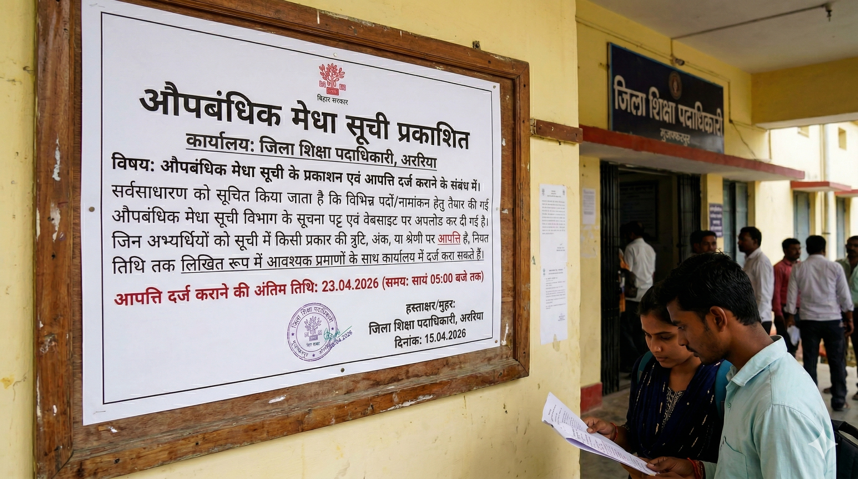 प्रकाशित औपबंधिक मेधा सूची में किसी भी प्रकार की आपत्ति के लिए जिला प्रोग्राम पदाधिकारी आई०सी०डी०एस०-सह-सदस्य सचिव, अररिया चयन समिति के कार्यालय (समाहरणालय परिसर, गेट संख्या-01, उद्योग भवन के पास, अररिया, पिन 854311) में निबंधित डाक अथवा हाथों-हाथ के माध्यम से अभ्यर्थी द्वारा दिनांक- 09.04.2026 से दिनांक- 23.04.2026 तक के कार्यालय कार्यावधि में लिखित रूप से साक्ष्य के साथ आपत्ति दर्ज कराई जा सकती है।