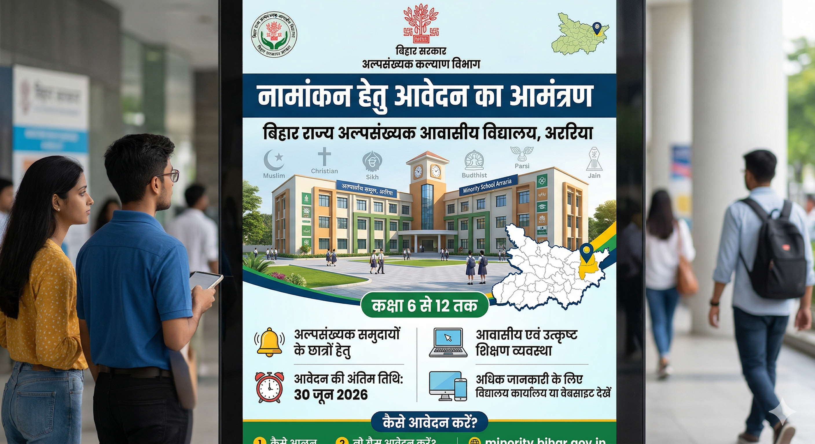 नजरिया न्यूज़, अररिया। बिहार में निवासित अल्पसंख्यक यथा-मुस्लिम, सिख, ईसाई, बौद्ध, जैन एवं पारसी समुदाय के छात्र/छात्राओं के लिये बिहार राज्य अल्पसंख्यक आवासीय विद्यालय, कटिहार, जमुई, नालंदा, मुजफ्फरपुर एवं कैमुर तथा कैम्प एट जिला सिवान, पूर्णियाँ, सहरसा, मुंगेर एवं सुपौल जिले में संचालित अल्पसंख्यक आवासीय विद्यालय शैक्षणिक सत्र-2026-27 के लिये वर्ग-09 एवं वर्ग-11 में नामांकन हेतु ऑनलाईन आवेदन आमंत्रित किये जा रहे हैं। दिनांक-01.04.2026 से 01.05.2026 तक इच्छुक योग्य छात्र/छात्राएँ आवेदन कर सकते हैं।