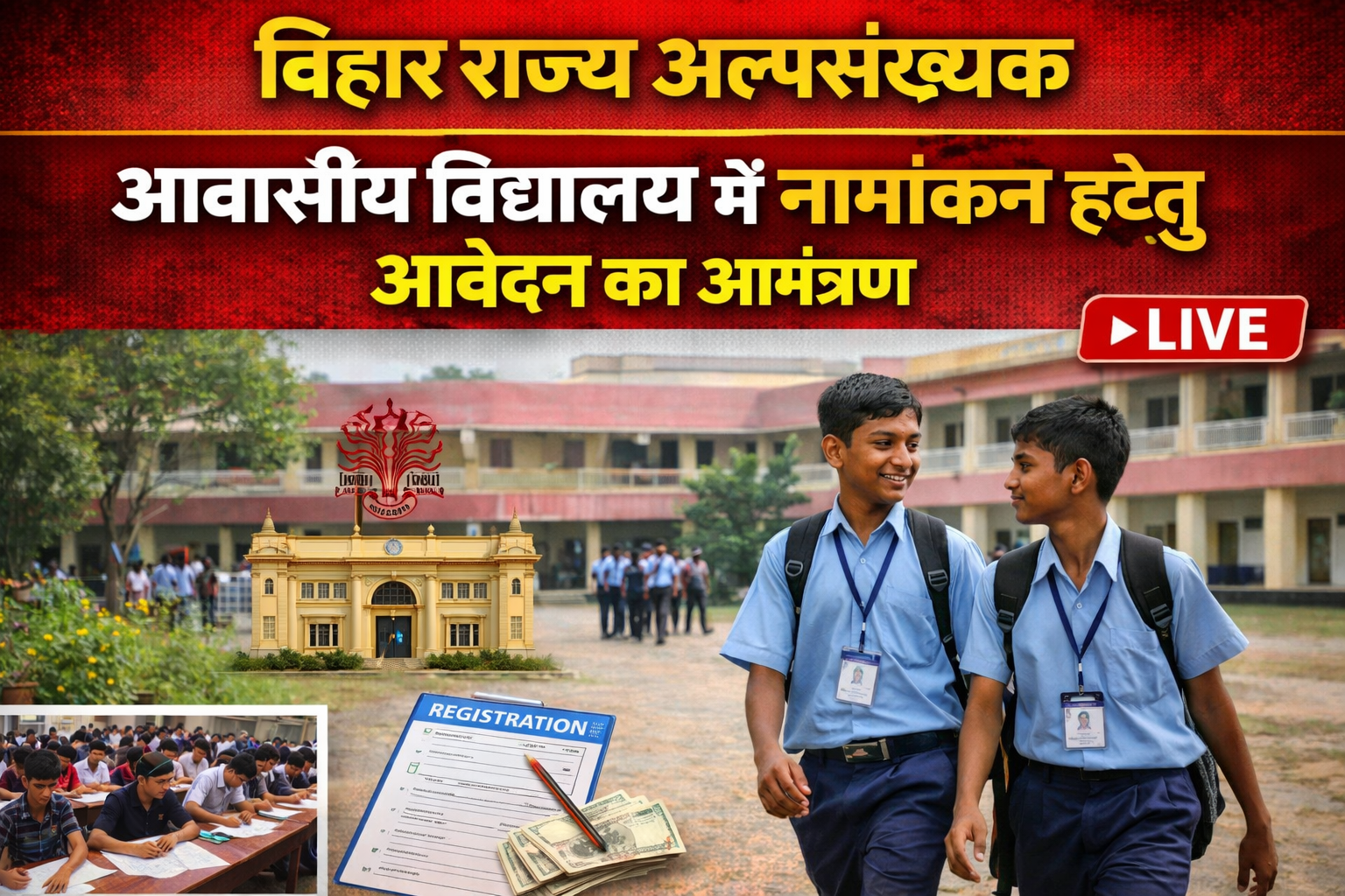 बिहार में निवासित अल्पसंख्यक यथा-मुस्लिम, सिख, ईसाई, बौद्ध, जैन एवं पारसी समुदाय के छात्र/छात्राओं के लिये बिहार राज्य अल्पसंख्यक आवासीय विद्यालय, कटिहार, जमुई, नालंदा, मुजफ्फरपुर एवं कैमुर तथा कैम्प एट जिला सिवान, पूर्णियाँ, सहरसा, मुंगेर एवं सुपौल जिले में संचालित अल्पसंख्यक आवासीय विद्यालय शैक्षणिक सत्र-2026-27 के लिये वर्ग-09 एवं वर्ग-11 में नामांकन हेतु ऑनलाईन आवेदन आमंत्रित किये जा रहे हैं। दिनांक-01.04.2026 से 01.05. 2026 तक इच्छुक योग्य छात्र/छात्राएँ आवेदन कर सकते हैं। आवेदन की प्रक्रिया ऑनलाईन विभागीय वेबसाईट- https://state.bihar.gov.in/minoritywelfare/CitizenHome.html पर उपलब्ध है।