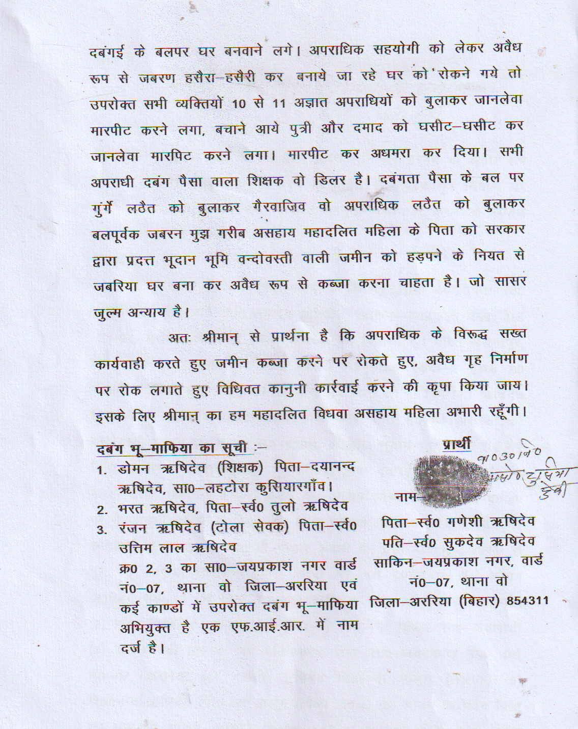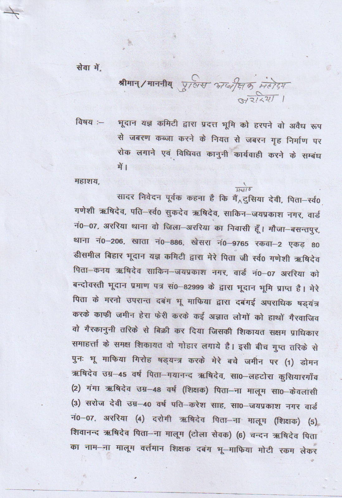 पीड़िता के अनुसार, मौजा बसंतपुर स्थित खाता संख्या-886, खेसरा संख्या-9765, कुल रकबा 2 एकड़ 80 डिसमिल भूमि उनके पिता स्वर्गीय गणेशी ऋषिदेव को बिहार भूदान यज्ञ कमिटी द्वारा विधिवत प्रमाण पत्र के माध्यम से दी गई थी। पिता के निधन के बाद इस जमीन पर कुछ दबंग भू-माफियाओं की नजर पड़ गई और उन्होंने कथित रूप से साजिश के तहत जमीन का कुछ हिस्सा गैरकानूनी तरीके से बेच दिया।