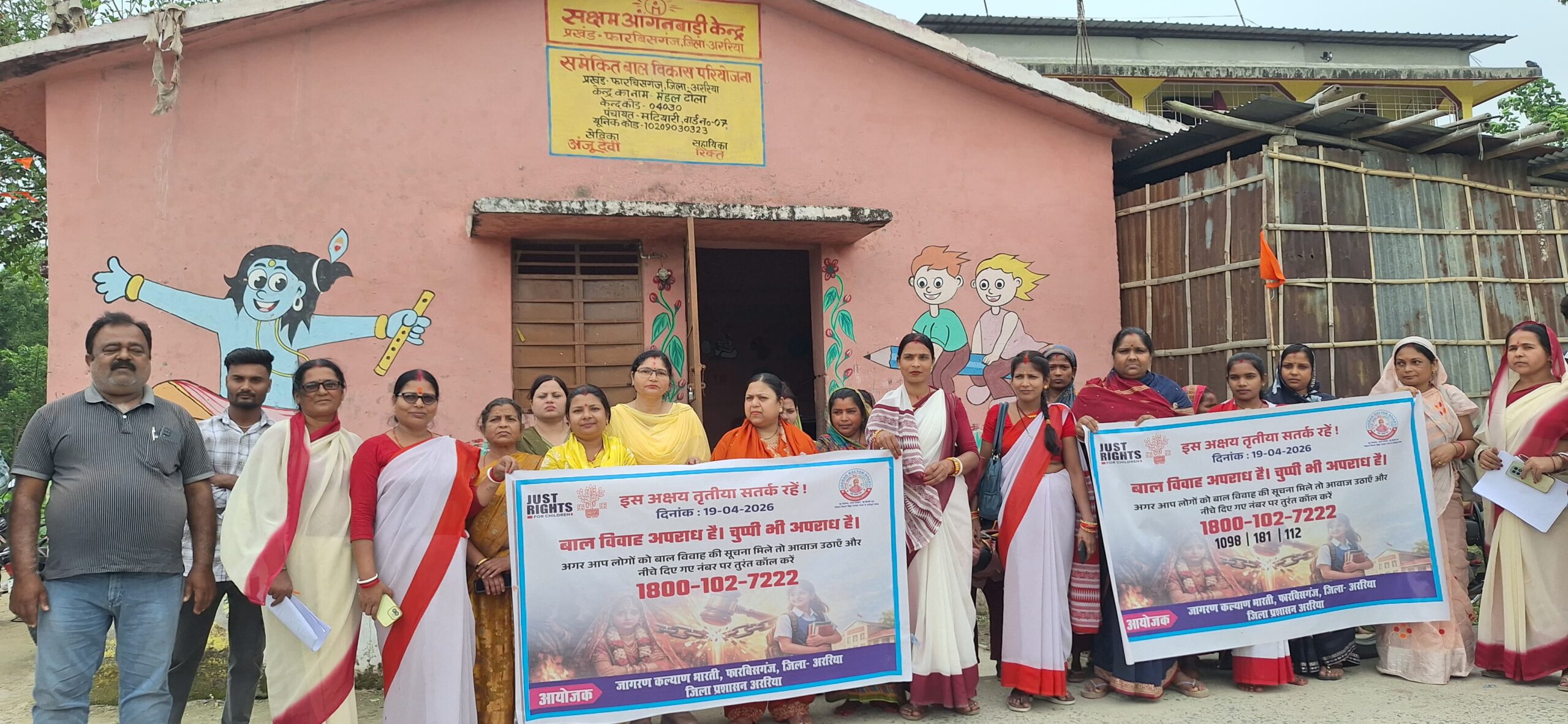 अररिया, 16 अप्रैल 2026: जिला पदाधिकारी, अररिया के निर्देश पर अक्षय तृतीया के अवसर पर बाल विवाह की रोकथाम को लेकर विशेष सतर्कता अभियान चलाया जा रहा है। इसी क्रम में 19 अप्रैल को मनाए जाने वाले कार्यक्रम के पूर्व फारबिसगंज प्रखंड के मटियारी पंचायत स्थित आंगनबाड़ी केन्द्र संख्या 04030 (मंडल टोला) में जागरूकता कार्यक्रम का आयोजन किया गया।