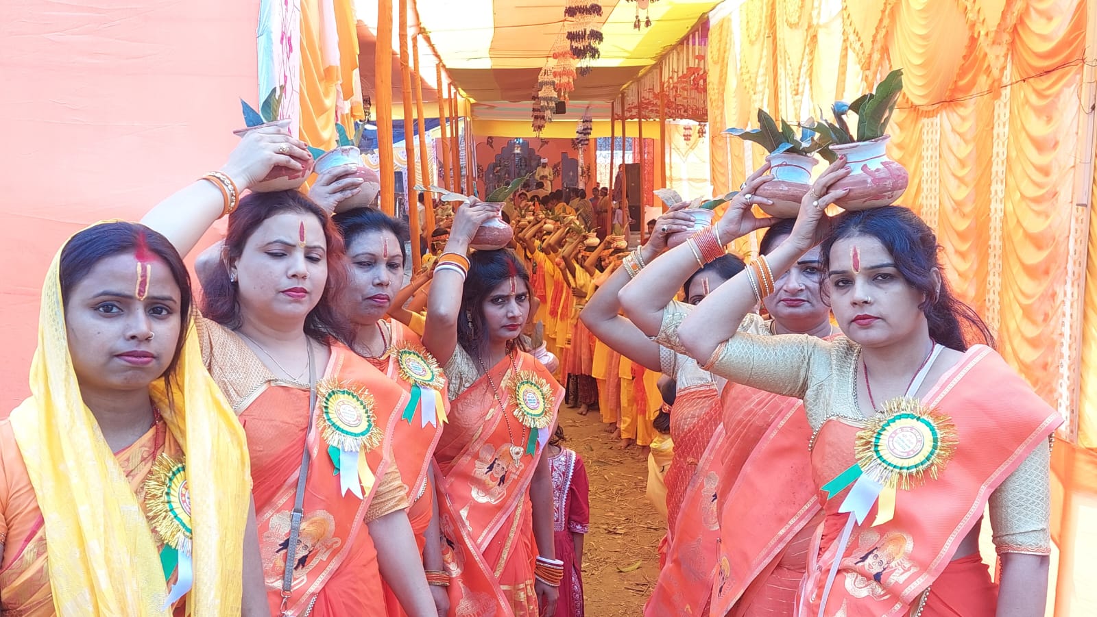 प्रखंड के बलतर पंचायत अंतर्गत खरुआ ग्राम में स्थित राम जानकी मंदिर सह चैरिटेबल गौशाला के नए मंदिर में नई प्रतिमा के प्राण प्रतिष्ठा उत्सव के पांच दिवसीय कार्यक्रम के तहत सोमवार को स्थानीय महिलाओं द्वारा भव्य शोभायात्रा निकाली गई। इस अवसर पर जहां सेकड़ों महिलाओं ने माथे पर कलश लेकर यात्रा आरंभ की, वहीं दूसरी तरफ महिलाओं के सहयोग में पुरुषों ने भी एक ही रंग, गेरुआ रंग के वस्त्र पहन कर शोभायात्रा में भाग लिया। जबकि सभी महिलाओं ने भी इसी रंग के वस्त्र पहने थे। जो कि बड़े मनभावन लग रहे थे। बताते चले की नव निर्मित मंदिर में भगवान राम, लक्ष्मण,माता सीता और राम भक्त हनुमान की आदम कद सफेद संगमरमर की प्रतिमा स्थापित की गई है। वहीं शोभा यात्रा खरुआ, जमीर होते हुए कोटा, करीमगंज होते हुए सिंघिया घाट तक पहुंची और महानंदा नदी के किनारे स्थित सिंघिया घाट में माता गंगा की पूजा अर्चना की गई, जहां बनारस से आए पंडितों ने वैदिक मंत्र उच्चारण के साथ कलश भरने को लेकर पूजा की, तथा मुख्य जजमान के रूप में सूरज शर्मा ने सर मुंडन करने के उपरांत मुख्य कलश को अपने सिर पर रखकर उसी रास्ते से अपनी टीम के साथ वापस मंदिर परिसर में पहुंचे।