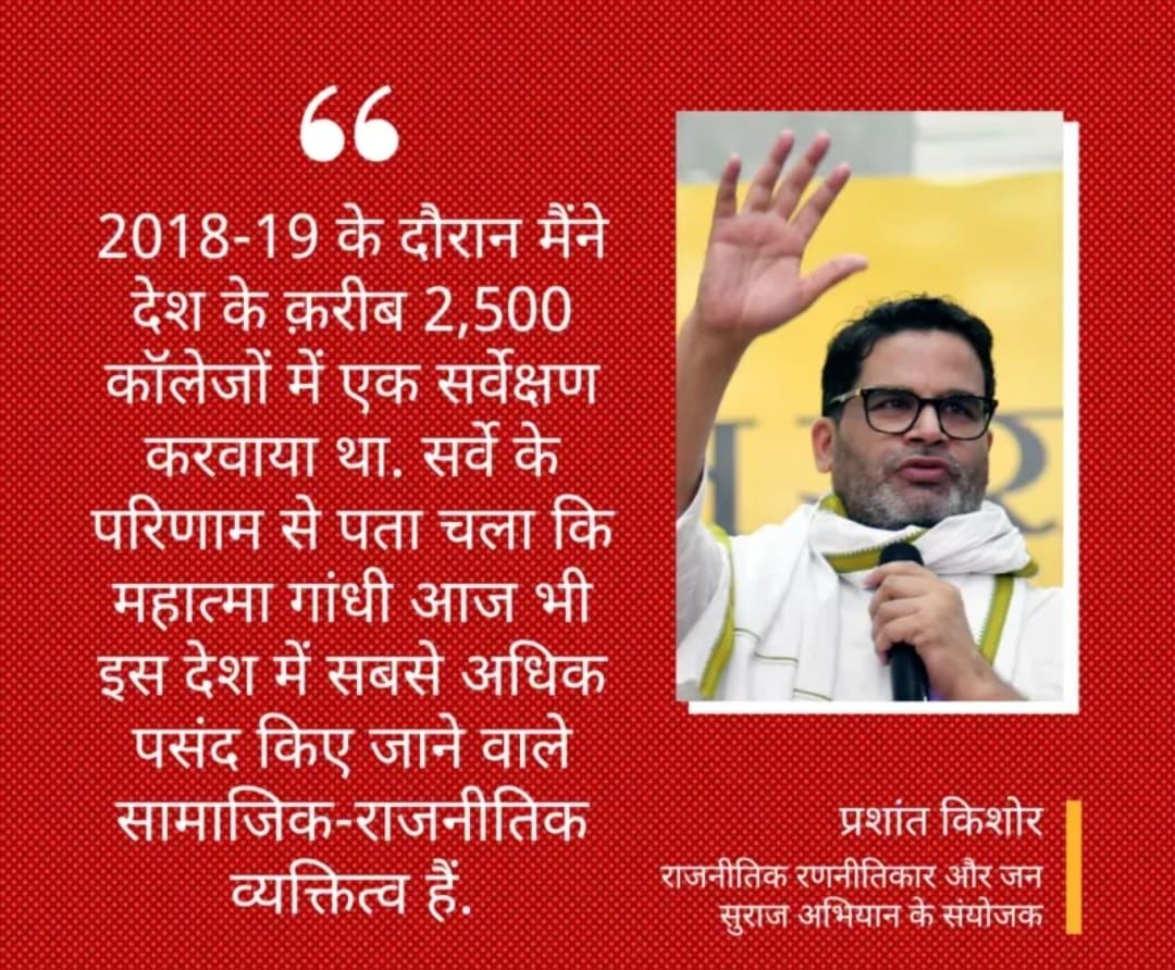 प्रशांत किशोर ने कहा, “2018-19 के दौरान मैंने देश के क़रीब 2,500 कॉलेजों में एक सर्वेक्षण करवाया था। सर्वे के परिणाम से पता चला कि महात्मा गांधी आज भी इस देश में सबसे अधिक पसंद किए जाने वाले सामाजिक-राजनीतिक व्यक्तित्व हैं।