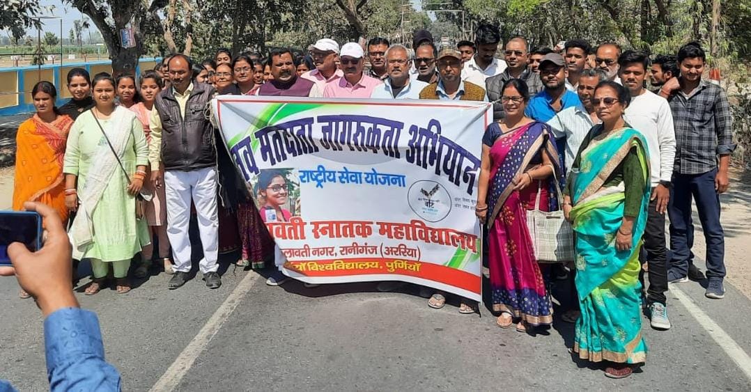 भारत निर्वाचन आयोग उच्चतर शिक्षा विभाग भारत सरकार एवं समन्वय राष्ट्रीय सेवा योजना पूर्णिया विश्वविद्यालय के निर्देशानुसार राष्ट्रीय सेवा योजना के तहत नव मतदाता जागरूकता अभियान चलाया गया।