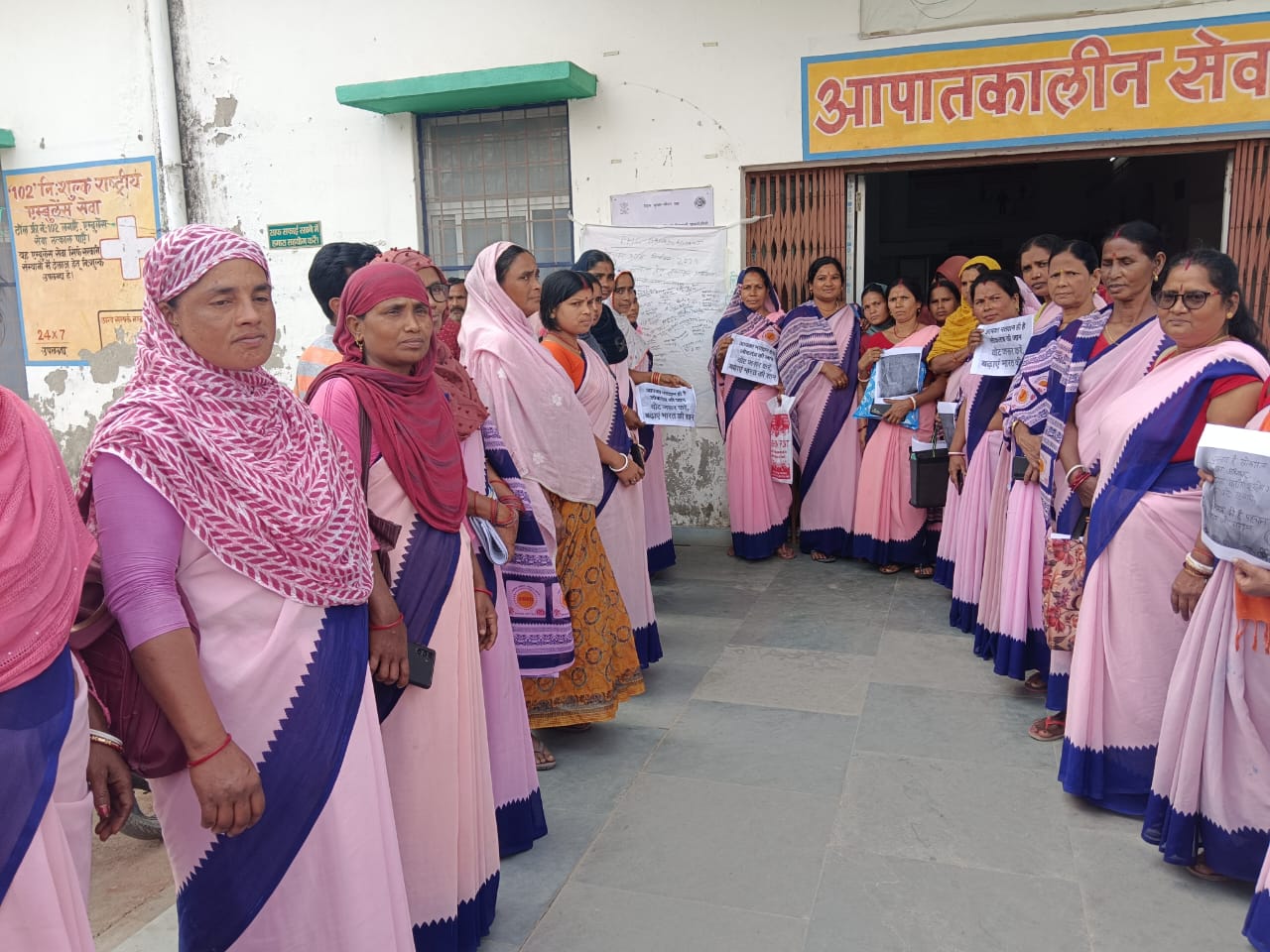 आशा समूह की महिलाओं के हाथों में तख्ती थी।