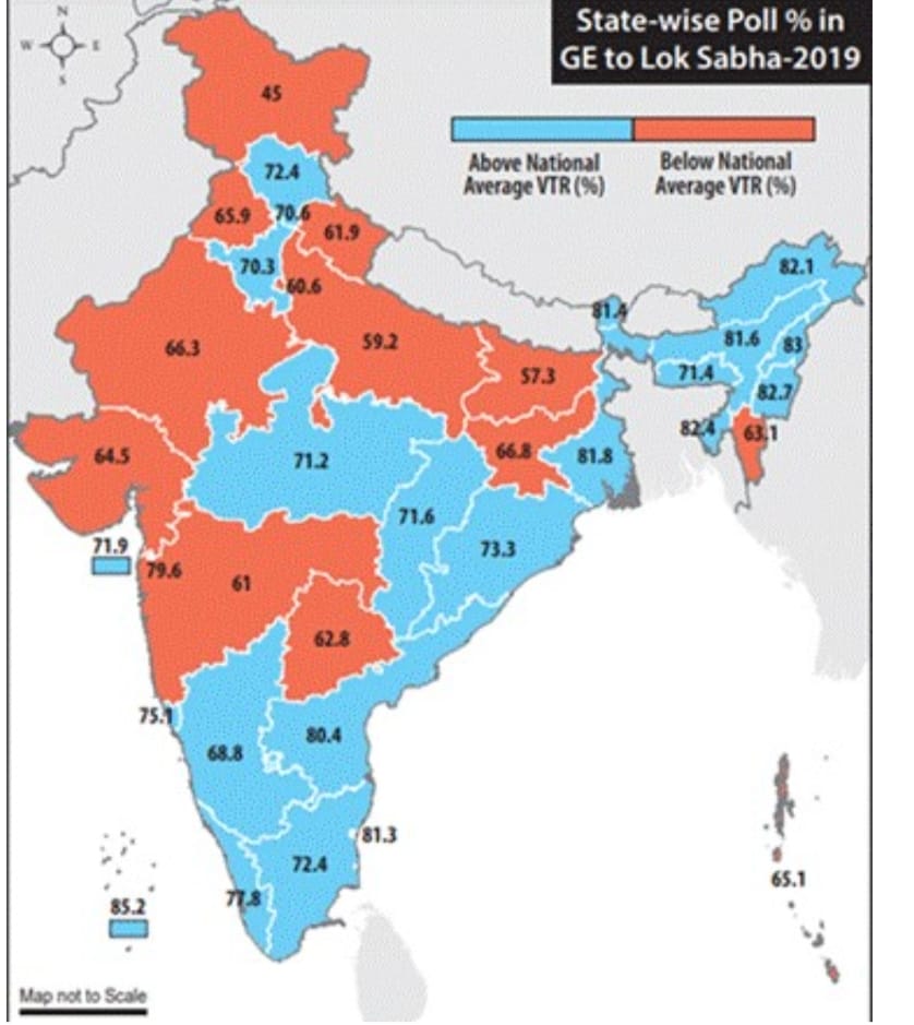 लोकसभा के 2019 के आम चुनावों में 11 राज्यों/केन्द्र शासित प्रदेशों अर्थात् बिहार, उत्तर प्रदेश, राष्ट्रीय राजधानी क्षेत्र दिल्ली, महाराष्ट्र, उत्तराखंड, तेलंगाना, गुजरात, पंजाब, राजस्थान, जम्मू और कश्मीर व झारखंड में मतदान प्रतिशत राष्ट्रीय औसत 67.40 प्रतिशत से कम था।