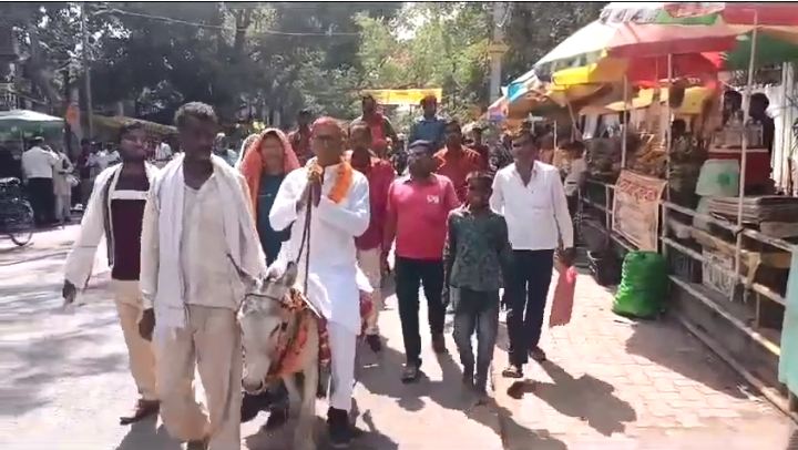 नजरिया न्यूज गोपालगंज। लोकसभा चुनाव के दौरान बिहार के गोपालगंज में अजब गजब नजारा देखने को मिला एक निर्दलीय प्रत्याशी नामांकन फॉर्म जमा करने गधे पर बैठकर डीएम कार्यालय पहुंचे, प्रत्याशी बैठा के अनुसार गोपालगंज के किसी नेता ने 30-40 वर्षों में किसी तरह का विकास नहीं किया और जनता को गधा बनाने का काम किया है, इसलिए वे जनता को जागरूक करने के लिए गधे पर बैठकर नामांकन जमा करने पहुंचे हैं।