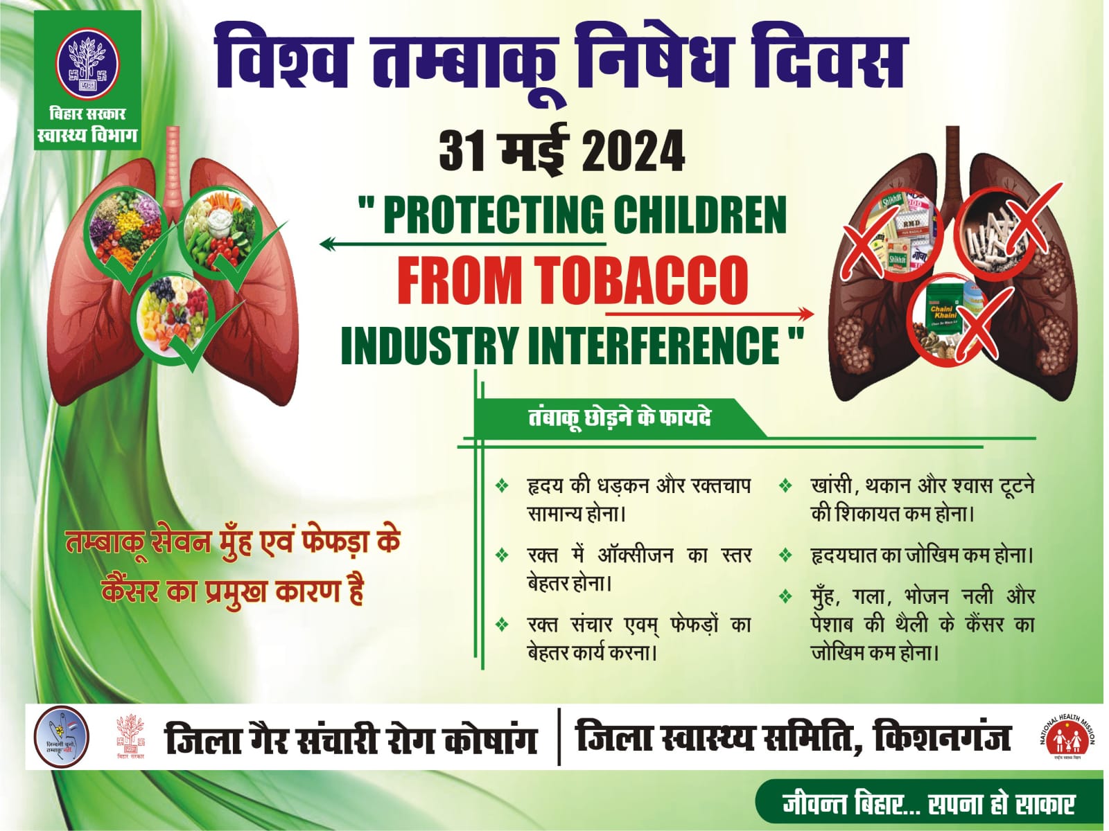 बहुत से नुकसानदायक बीमारियों की शुरुआत के पीछे तम्बाकू का सेवन ही मुख्य कारण होता है। तम्बाकू के सेवन के प्रति रुचि आजकल न सिर्फ युवाओं में बल्कि स्कूली बच्चों में बढती जा रही है। तम्बाकू सेवन बहुत से गंभीर बीमारियों की जड़ है। इसलिए इसको रोकने और इसके बारे में लोगों को जागरूक करने के लिए हर वर्ष 31 मई को पूरे विश्व में विश्व तम्बाकू निषेध दिवस मनाया जाता है। बताते चलें कि विश्व तम्बाकू निषेध दिवस की शुरुआत डब्ल्यूएचओ द्वारा 1987 में की गयी थी। इस दिन का उद्देश्य तंबाकू सेवन के व्यापक प्रसार और नकारात्मक स्वास्थ्य प्रभावों की ओर ध्यान आकर्षित करना है, जो वर्तमान में दुनिया भर में हर साल 70 लाख से अधिक मौतों का कारण बनता है। विश्व तंबाकू निषेध दिवस 2024 की थीम ‘बच्चों को तंबाकू उद्योग के हस्तक्षेप से बचाना’ है. यह थीम उन नीतियों और उपायों की वकालत करने पर केंद्रित है जो तंबाकू उद्योग को हानिकारक तंबाकू उत्पादों के साथ युवाओं को लक्षित करने से रोकते हैं की थीम पर जिले के सभी स्वास्थ्य संस्थानों में मनाया जायेगा |